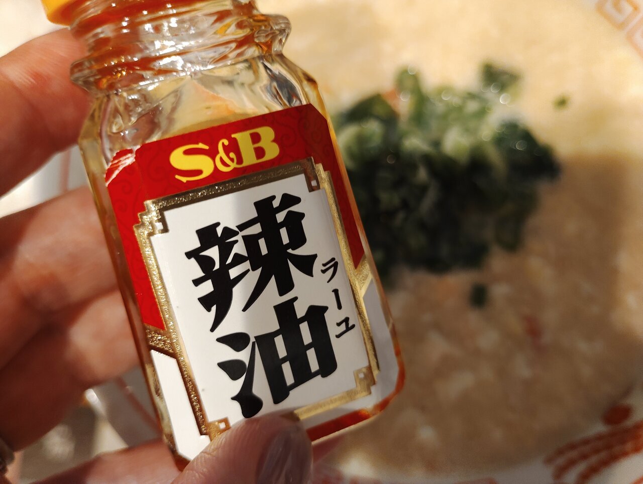 Ryuji's "Chinese-style Tofu Crab Zosui" is complete! The aroma of sesame oil and the chili oil drizzled on top tantalizes the appetite.