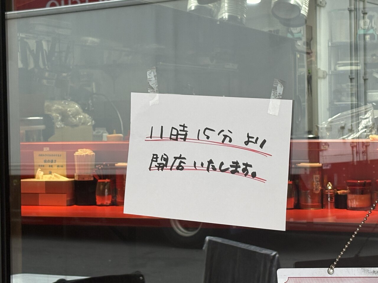 The opening time is 11 AM. I arrived a little early at 10:55 and found one customer ahead of me. Just then, a staff member called out, “Excuse me, we’re opening at 11:15 today!” In the end, the noren was raised at 11:24. I noticed a line of about seven people forming behind me, indicating its popularity even on a weekday. The inside has about 18 seats, combining counter and table seating. The red counter is striking and creates a nostalgic atmosphere.