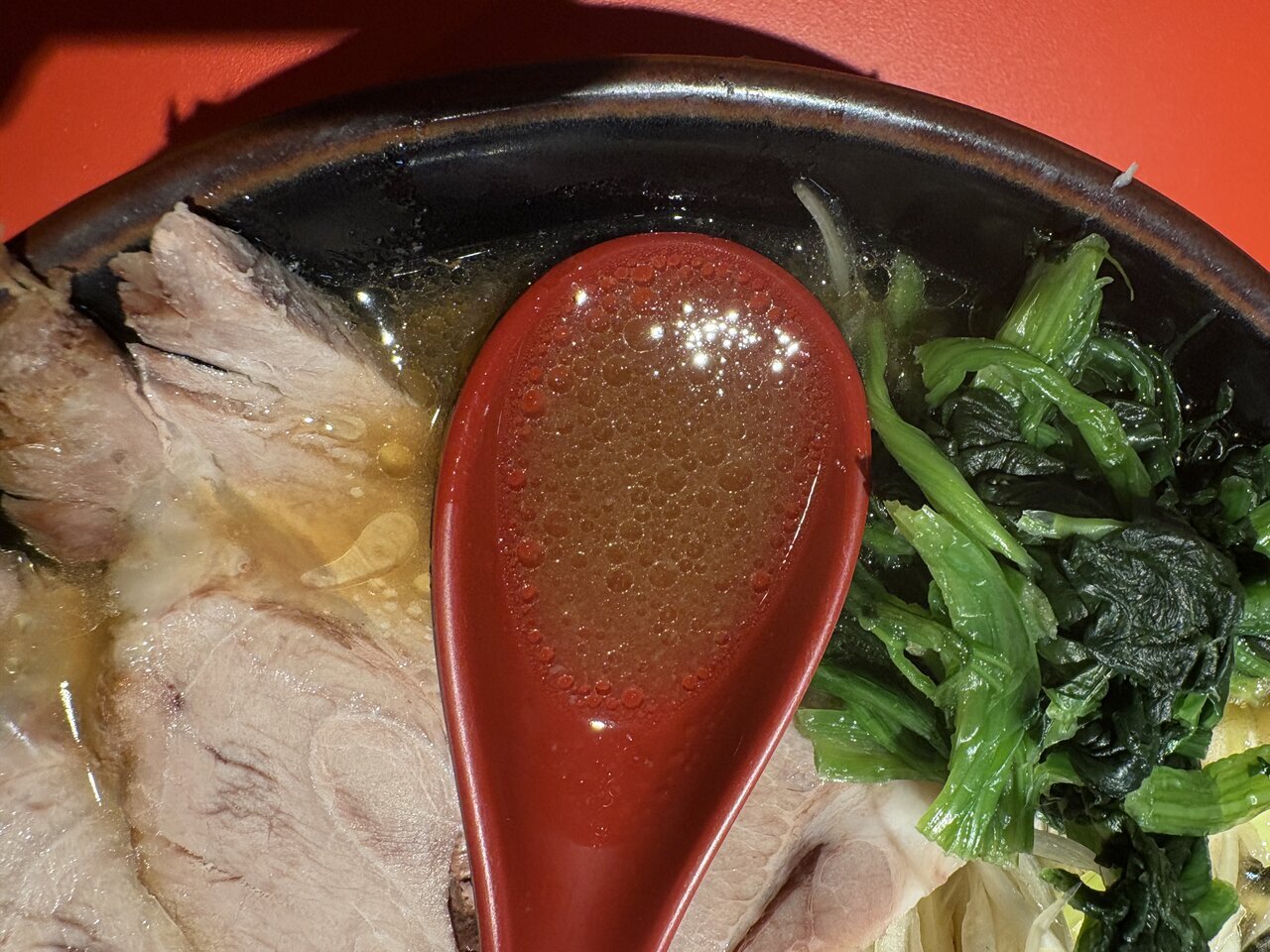 The moment the bowl arrived, I couldn't help but be captivated. The large slices of char siu spread out, filling the bowl. Next to it, a mound of shredded white green onions and deep green spinach. On the back, nori (seaweed) is present, tightening the overall color scheme. There are no gaps to be seen, and it gives a sense of structured beauty in this bowl.