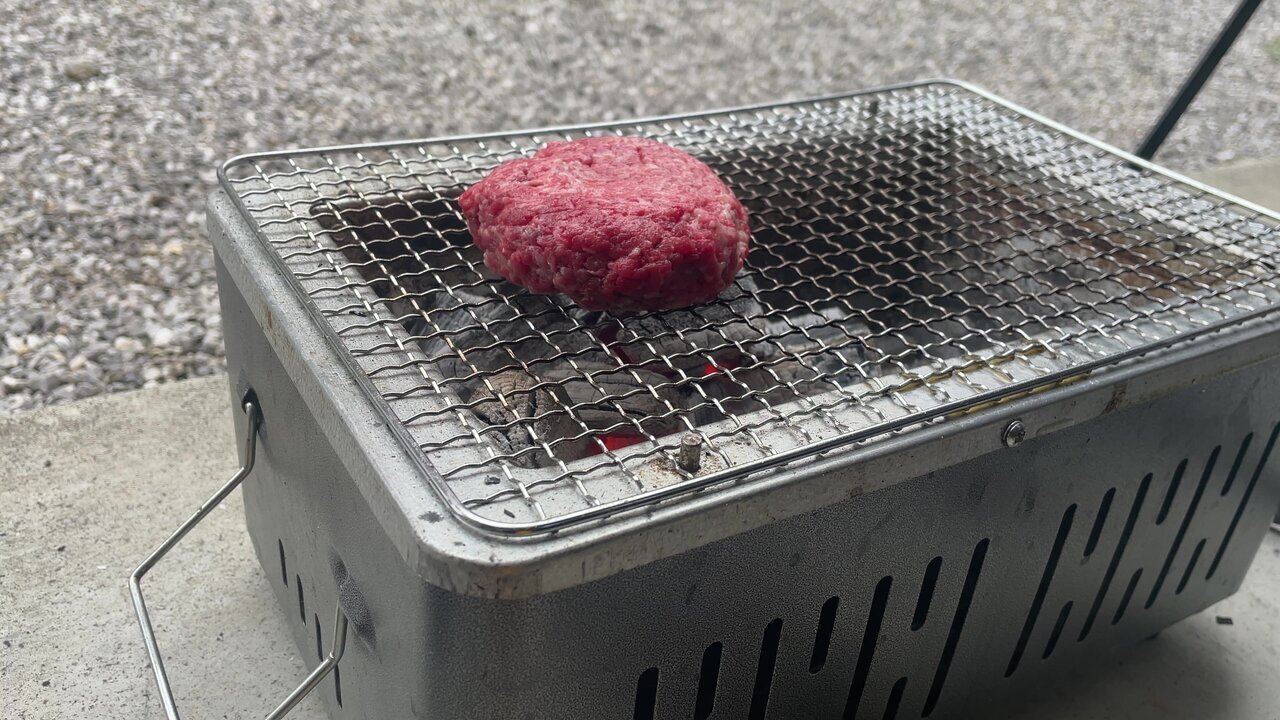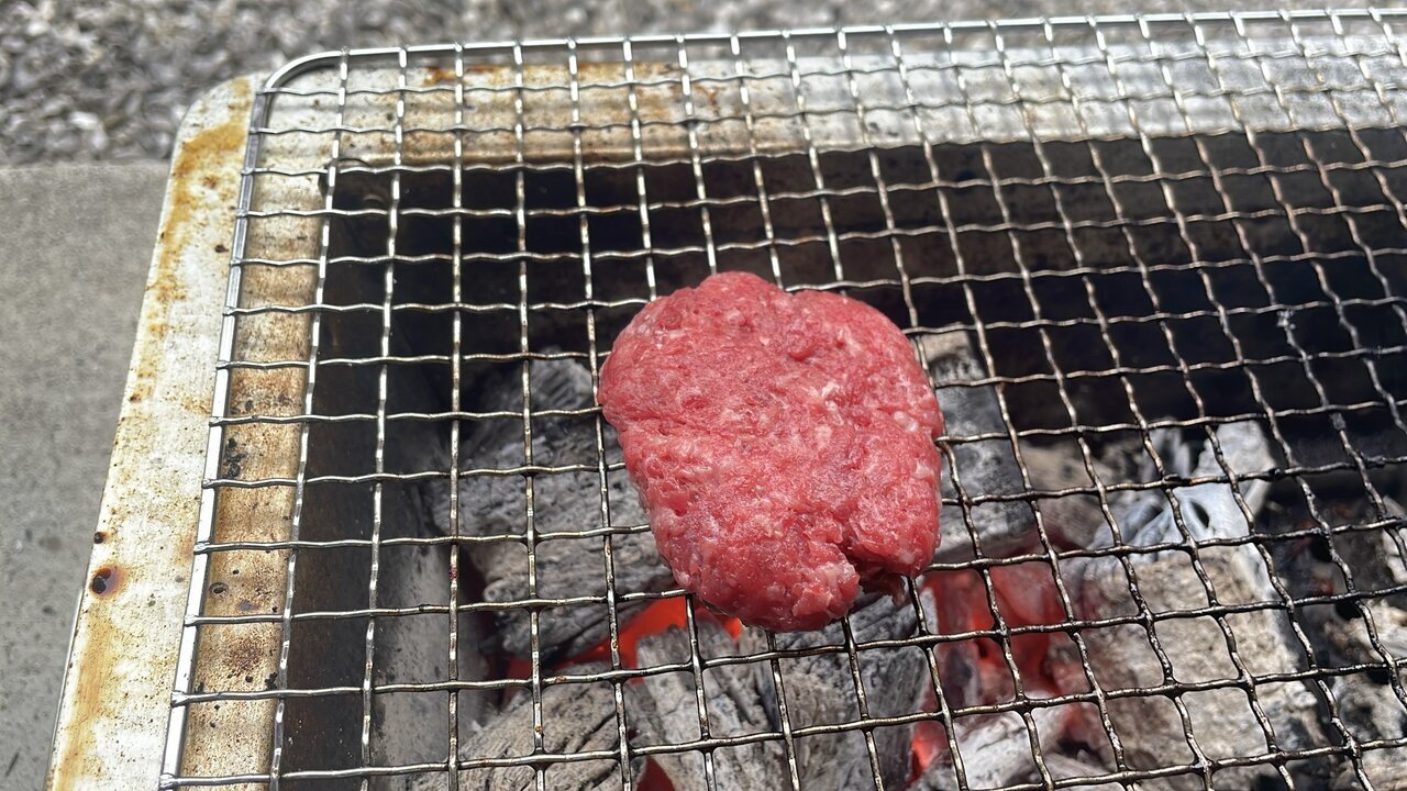 The aforementioned YouTuber mostly just grilled the meat without kneading it, so I simply shaped it into a round ball and placed it on the grill. I didn't season it at all. Even so, it's freshly ground domestic beef from the butcher, so it looks good and delicious.