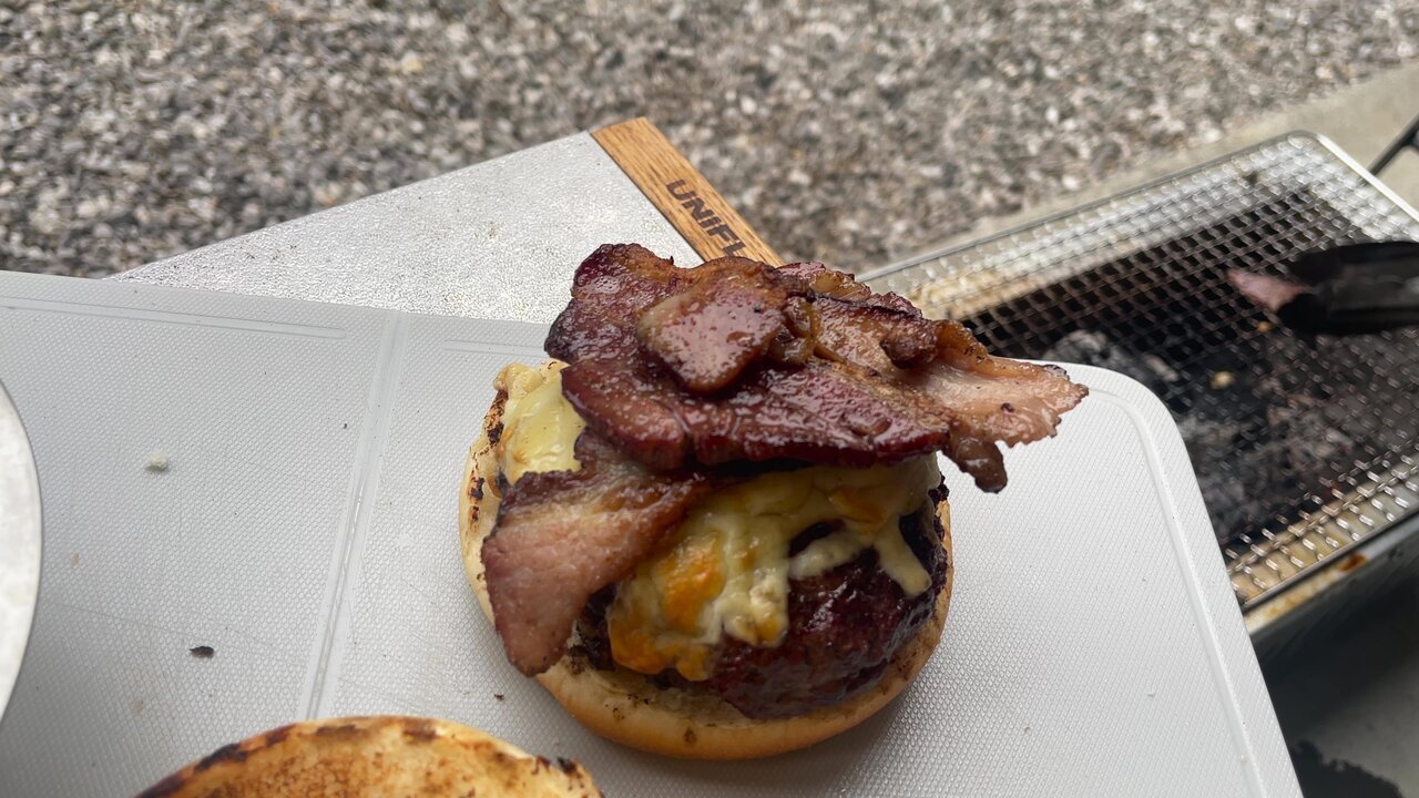 I placed the patty and bacon on the buns, added ketchup and mustard, and it was complete. It took a bit more effort than I expected.