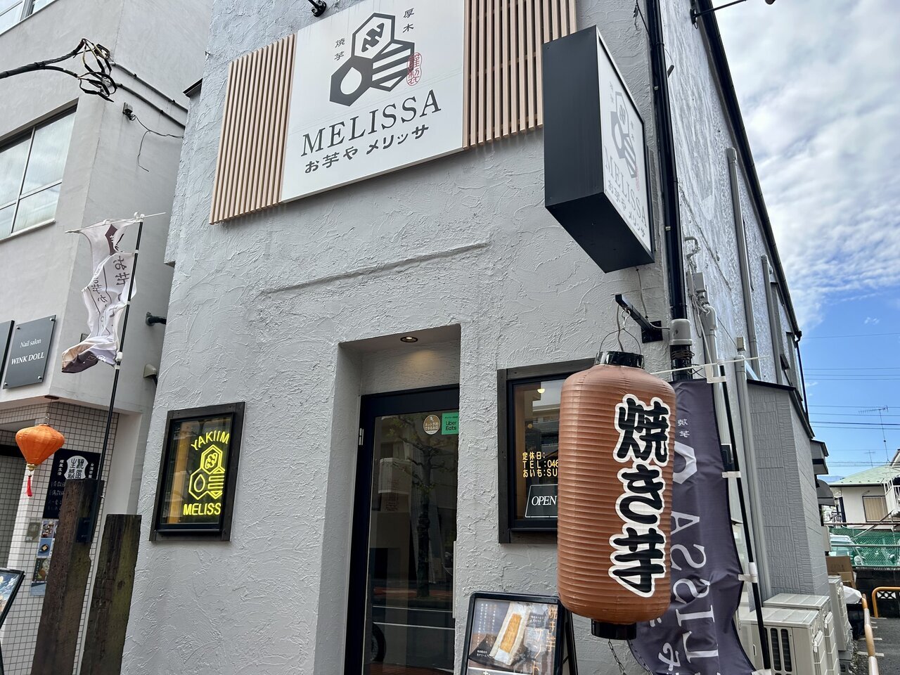 Next, we stopped by "Oimo ya MELISSA," located in Asahi Town, Atsugi City, Kanagawa Prefecture. It's a convenient location, just a 6-minute walk from Hon-Atsugi Station (south exit) on the Odakyu Line. The baked sweet potatoes are characterized by their original cooking method, taking more than 2 hours to bake thoroughly.