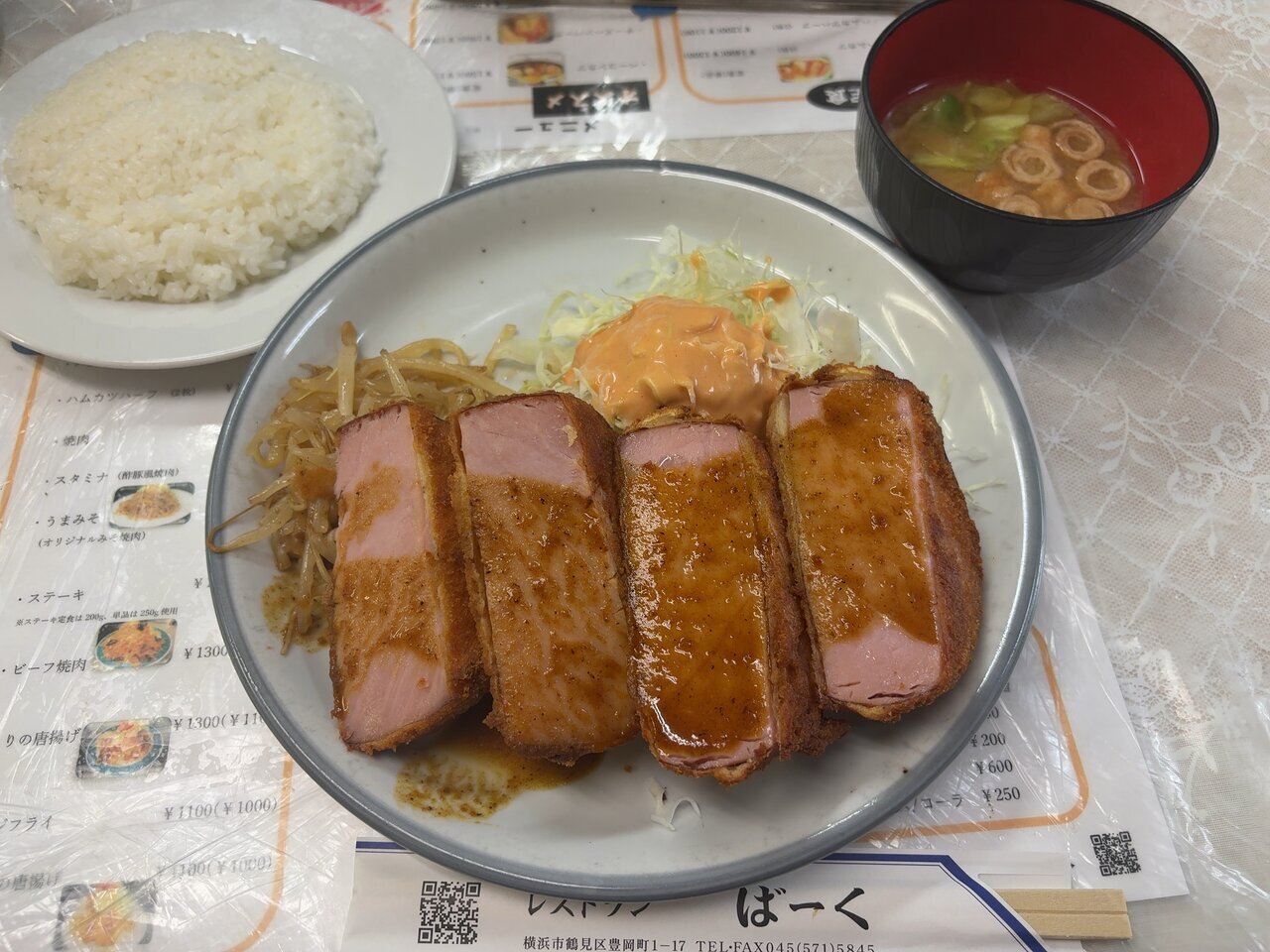 Located under the elevated rail at the west exit of Tsurumi Station on the JR Tsurumi Line in Yokohama City, Kanagawa Prefecture, "Restaurant Burg" has been serving Western cuisine for 55 years. I experienced the nostalgic atmosphere of the Showa era and tasted their famous "ham cutlet set meal," enjoying the flavors of this long-established eatery.