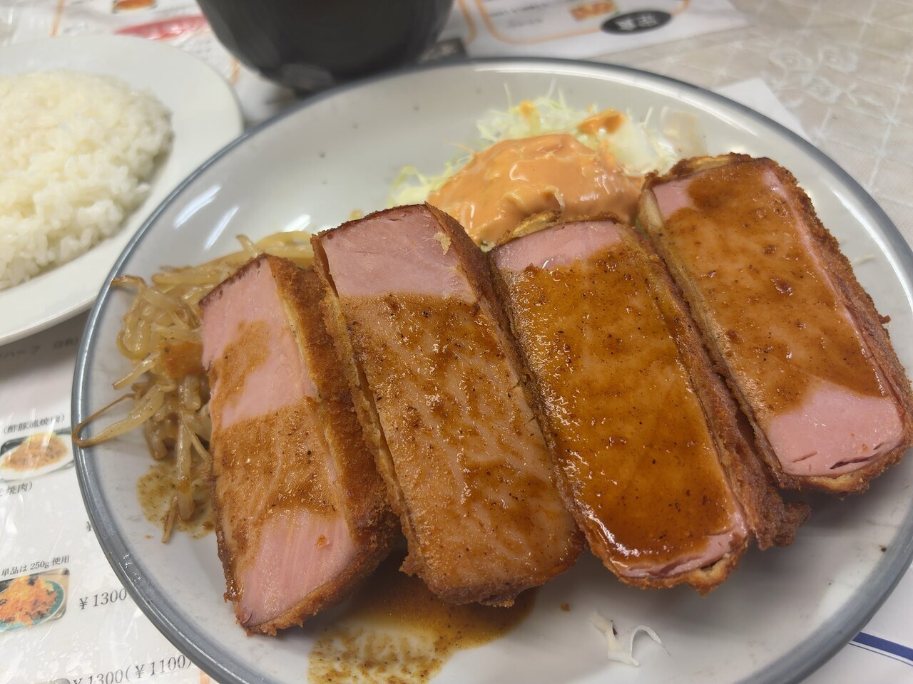 I had already decided on what I wanted to order. As soon as I sat down, without hesitation, I said, “I’ll have the ham cutlet set, please.” After just 6 minutes of waiting, the first thing that arrived was a plate of rice, steaming white.