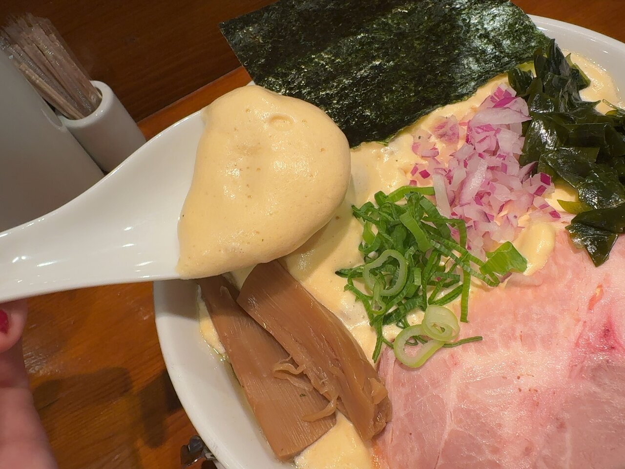 I experienced the much-talked-about limited quantity natto ramen at "Gonen Shokudo," directly connected to the west exit of Yokohama Station. The combination of the fluffy natto mousse whipped with a blender and the ultra-thin noodles was lighter than I imagined, making it just the right bowl for an adult's detour.