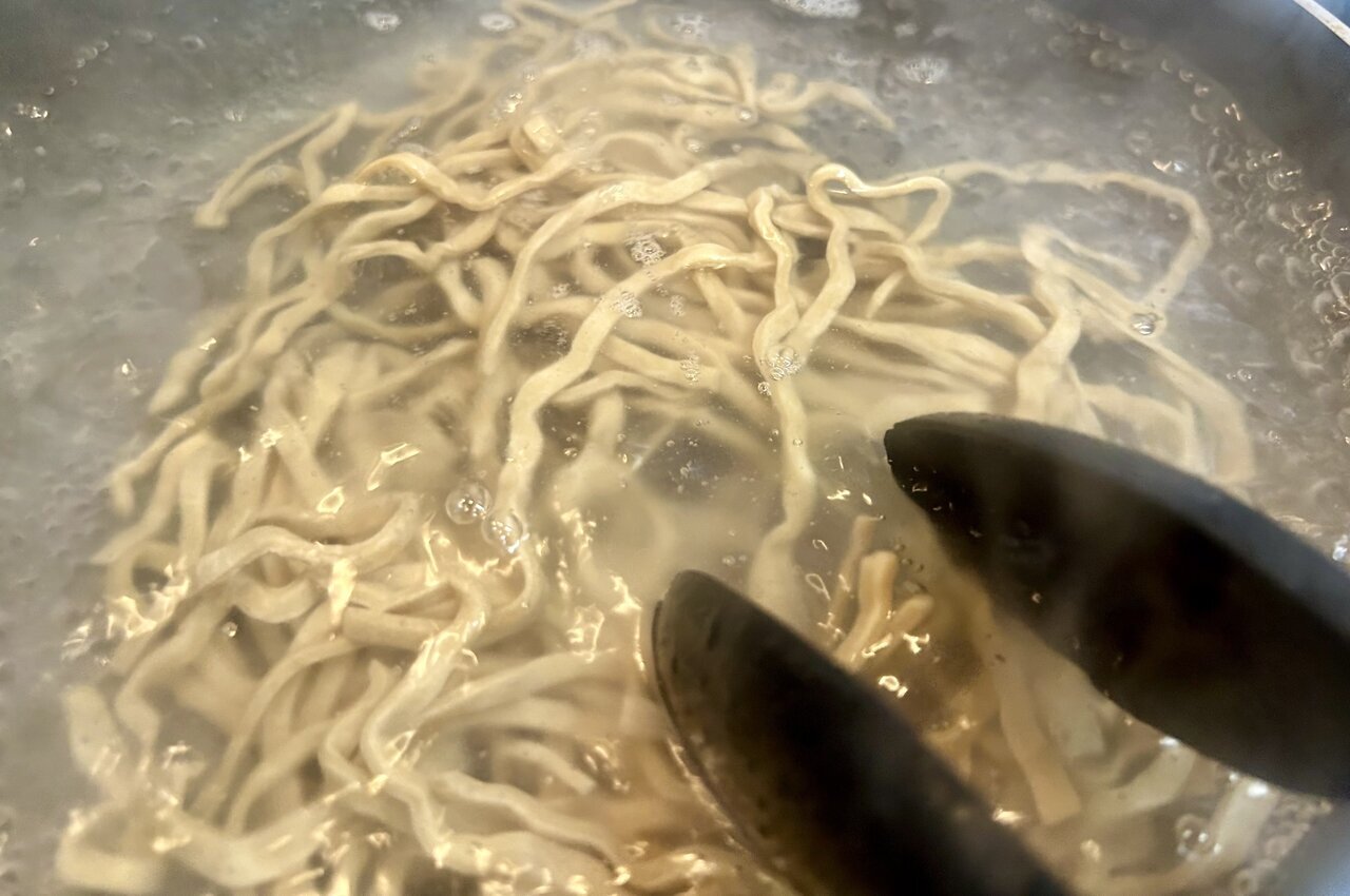 Once the chashu is ready, it's time to boil the noodles sold at Seven-Eleven. These thick noodles create a unique chewy texture that is different from the usual instant ramen you find at home, typical of Jiro-style ramen.