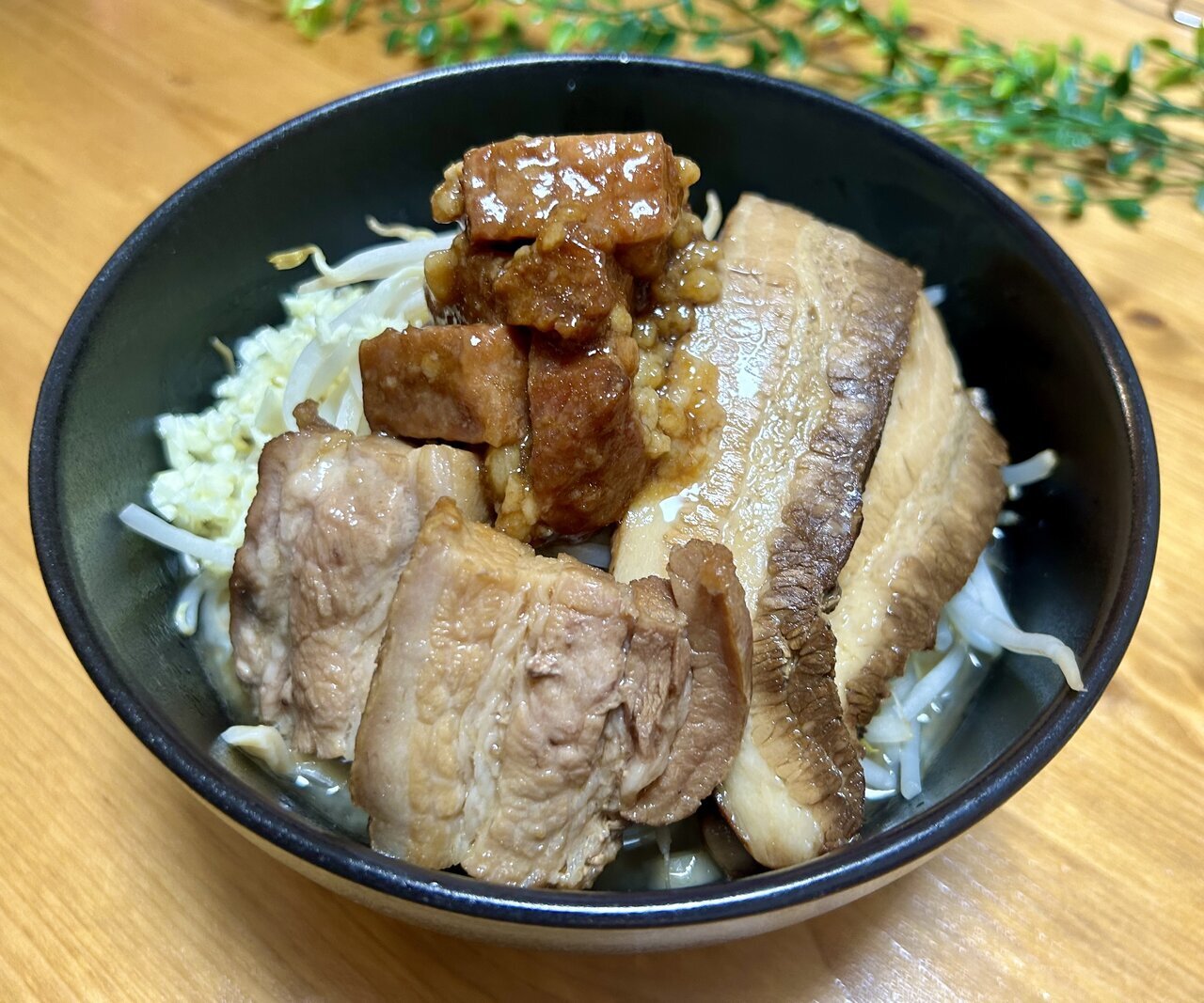 The finishing touch is a rich soup with the boiled chewy noodles, crunchy boiled bean sprouts (yasai), homemade chashu (buta), and generously topped with additional fat, and it's complete. The fact that you can lavishly top it with such a large amount of chashu is all thanks to making it yourself! The aroma that wafts up with the steam is surprisingly authentic, but how does it taste?