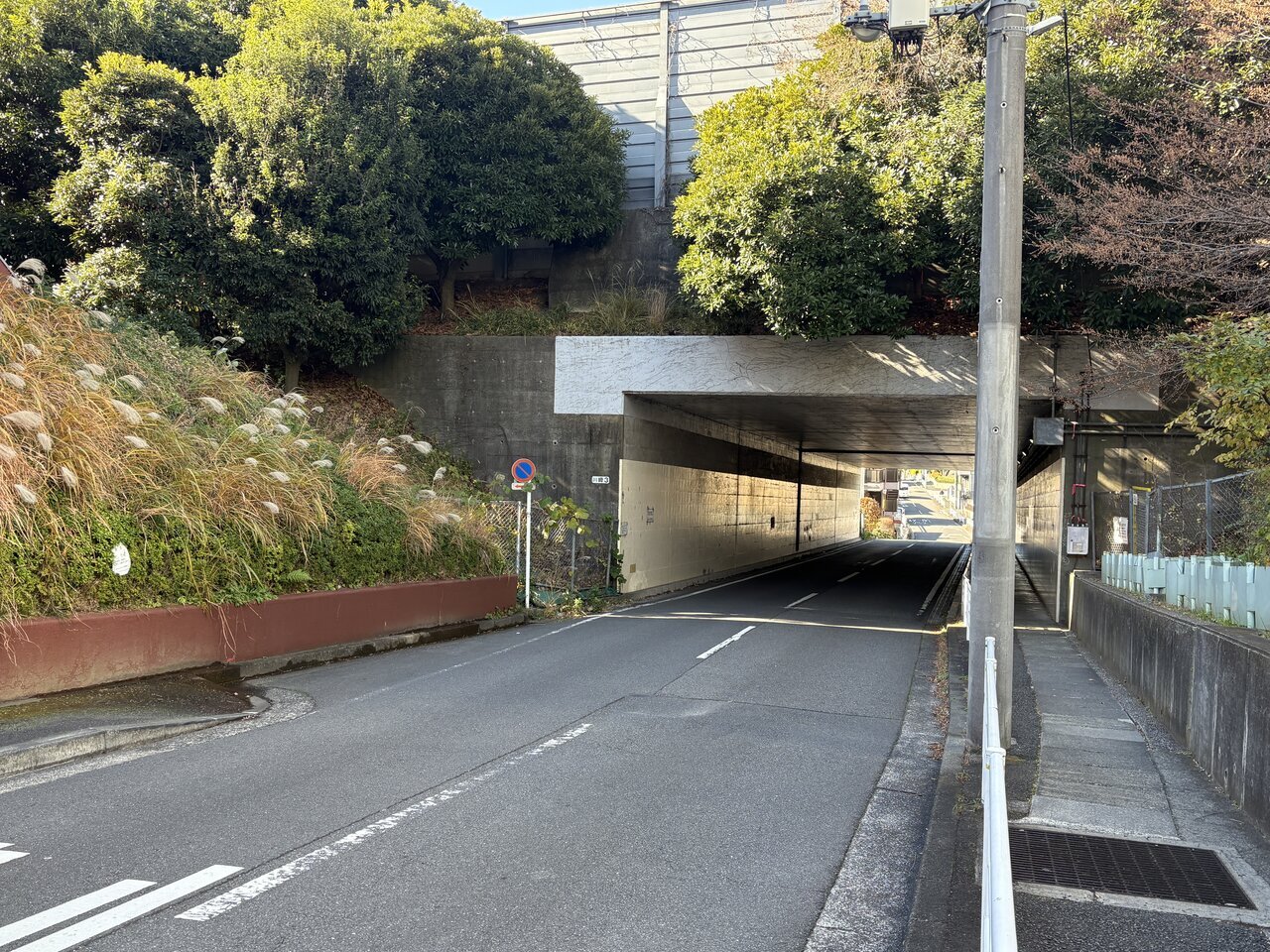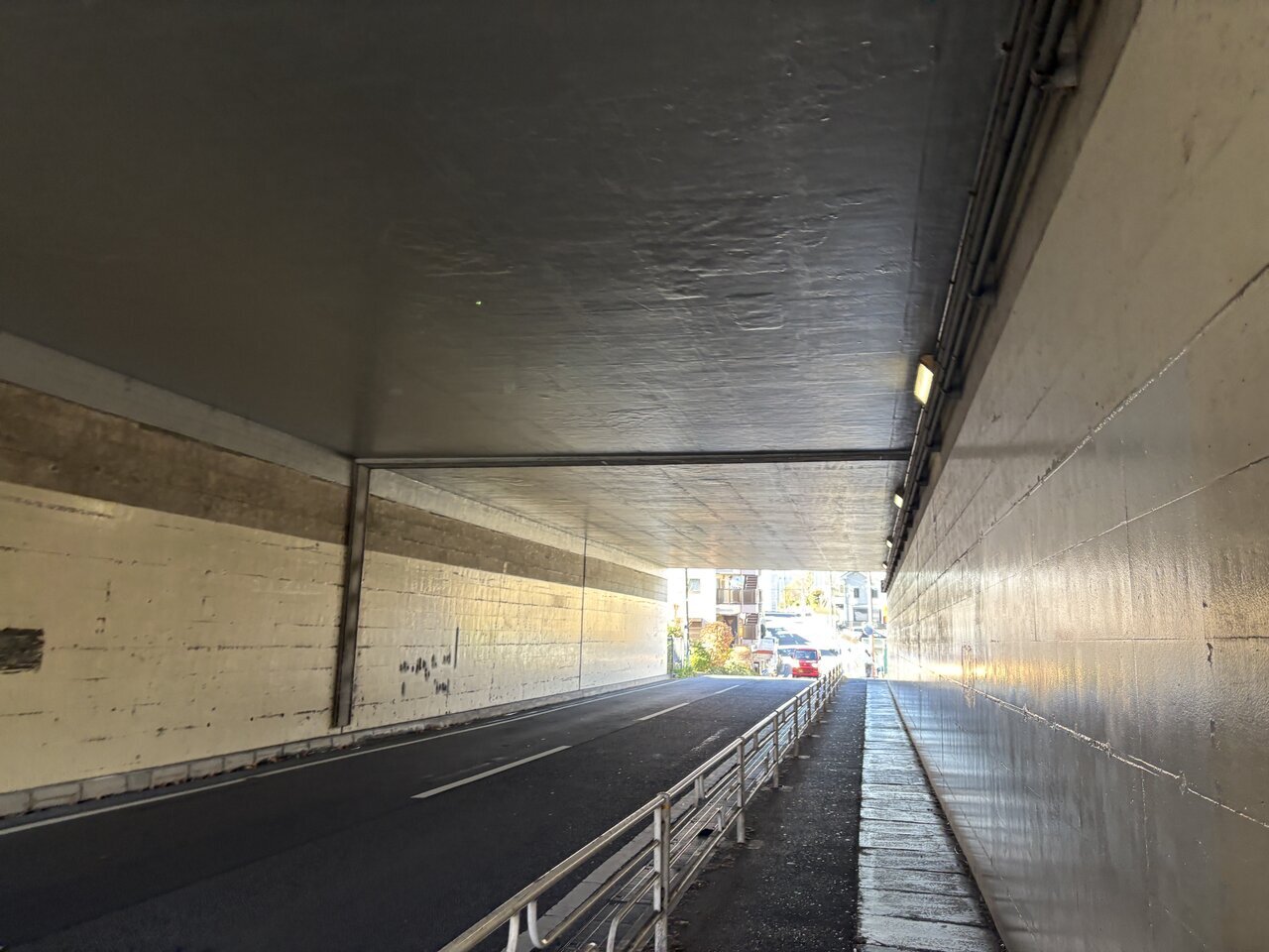As you continue further, you reach a tunnel that goes above you on the Tomei Expressway. The sound of cars flowing above resonates, and the momentarily narrower view gives a sense of the change in the scale of the city.