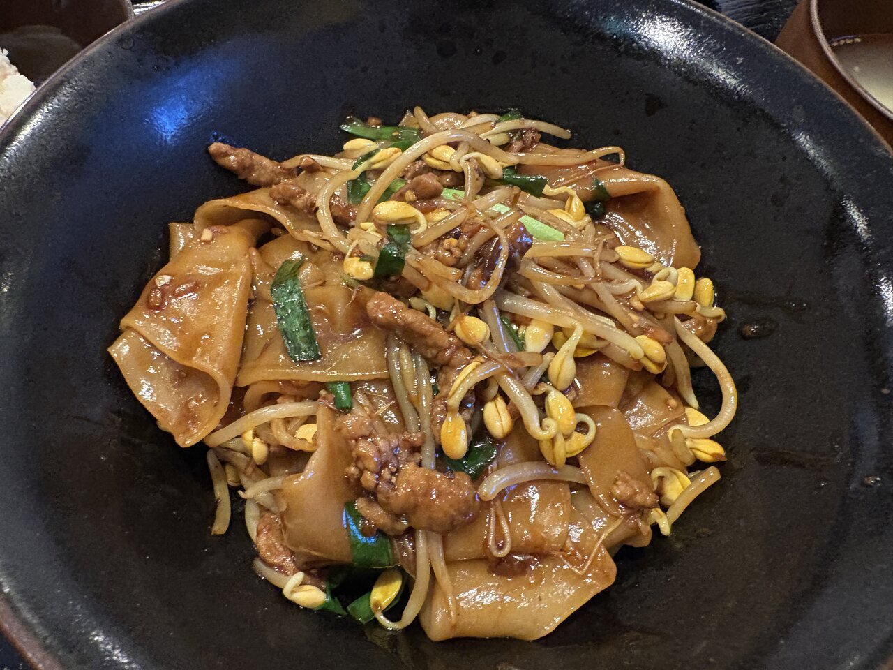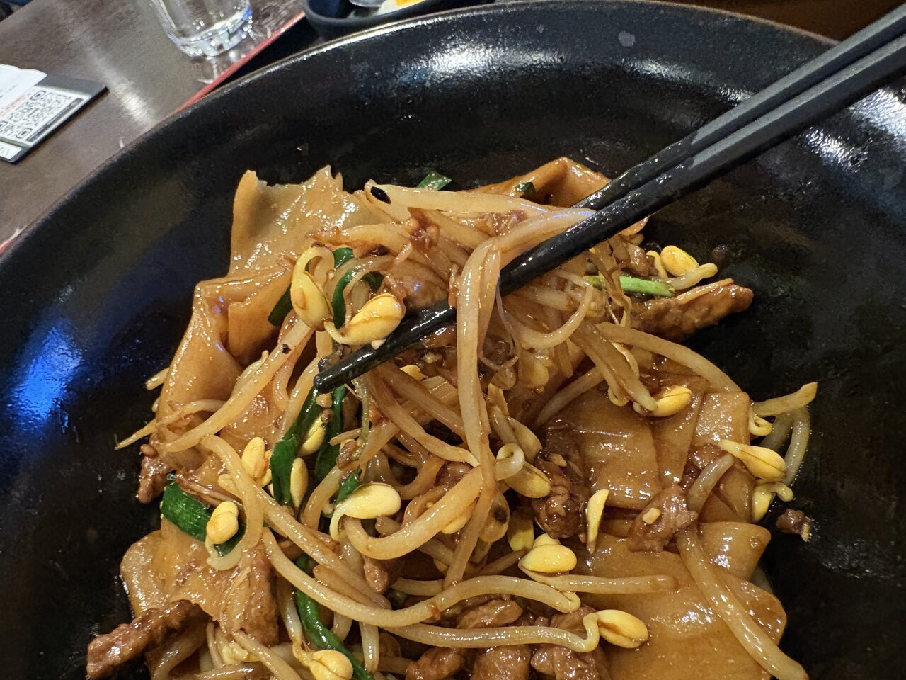 The ingredients consist of a simple combination of bean sprouts, chives, and meat, but they pair well with the wide noodles, enhancing the satisfaction with every bite. It's more of a dish to savor by chewing than to slurp.