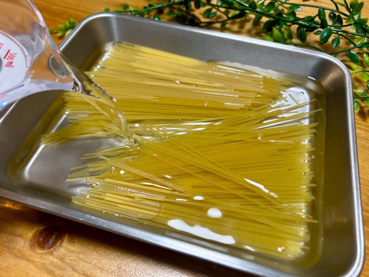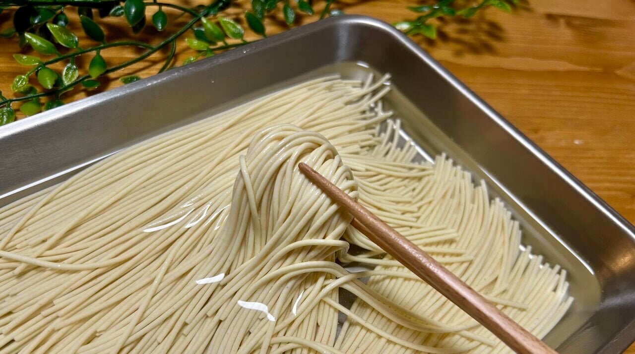 The image above shows the pasta that was actually soaked in water for 4 hours. The pasta used was SELVA's spaghetti (1.5mm), which normally has a cooking time of 6 minutes. It has developed a chewy elasticity that makes it hard to believe it was dry pasta in the first place, as the surface has turned white. This time, a flat tray was used, but in an emergency, using a resealable storage bag or a plastic bottle for preparation is also a good idea.