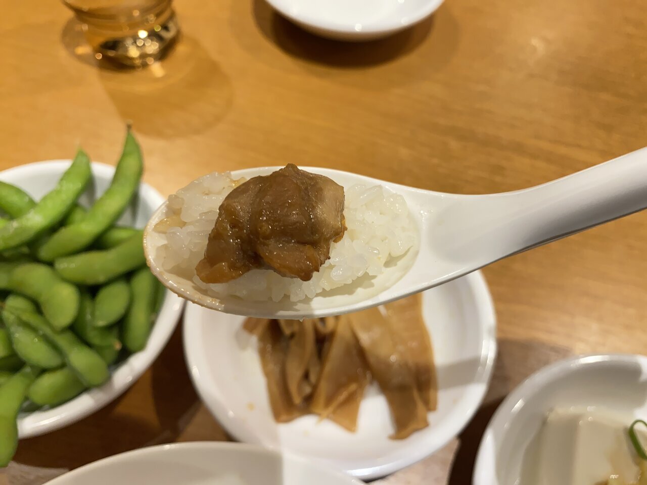 First, I’ll start with the main dish of yakitori and rice. The well-seasoned yakitori pairs perfectly with the rice. It makes me want to eat more rice. But the temptation from the menma is incredible... It catches my eye for some reason. "Hurry up and eat!" the pressure is intense.