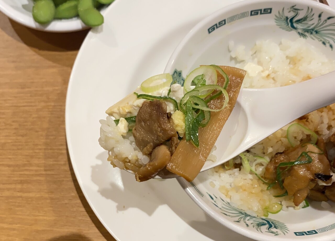 This was quite幸せ. Ginger, menma, yakitori, and rice are the best. The tofu, while completely a supporting role, occasionally coolly asserts itself, making me feel warm inside as if to say, "Sorry, I haven't forgotten about you."