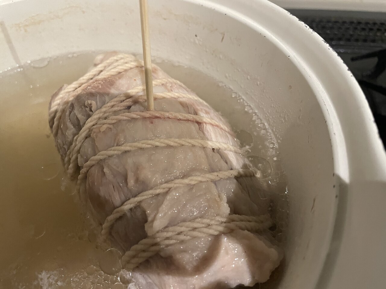 Fill a pot with enough water to submerge the meat, bring it to a boil, then reduce to low heat and maintain a temperature of 85℃ to 90℃ while boiling for 50 minutes. Since I don't have a thermometer, keeping this temperature was difficult, and I visually judged the cooking by looking for a bubbling state. A bamboo skewer should easily pierce through, and you can check if it’s done by feeling the heat of the skewer.