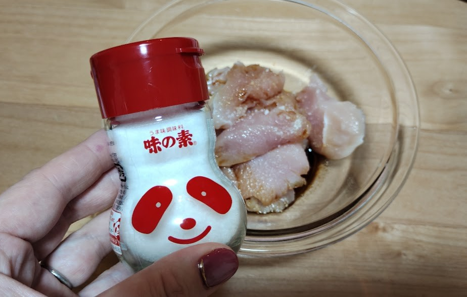 After slicing the chicken breast into 1 cm wide pieces, place them in a bowl, add salt, soy sauce, and Ajinomoto, and mix well.