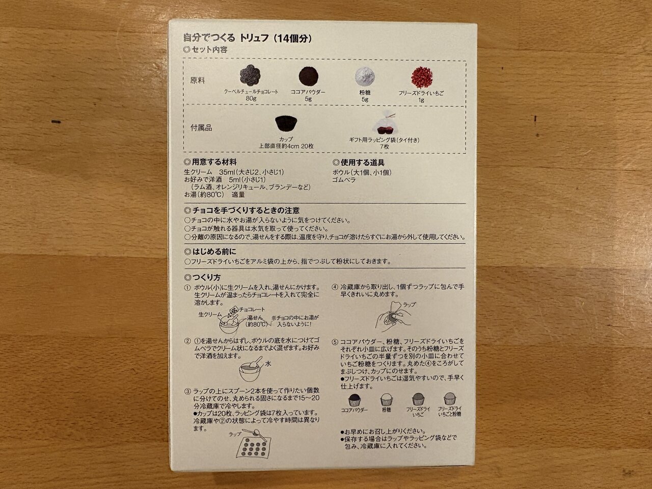 Couverture chocolate, cocoa powder, powdered sugar, freeze-dried strawberries. In addition to these, there were cups for putting the chocolate in and even gift wrapping bags with ties enclosed.