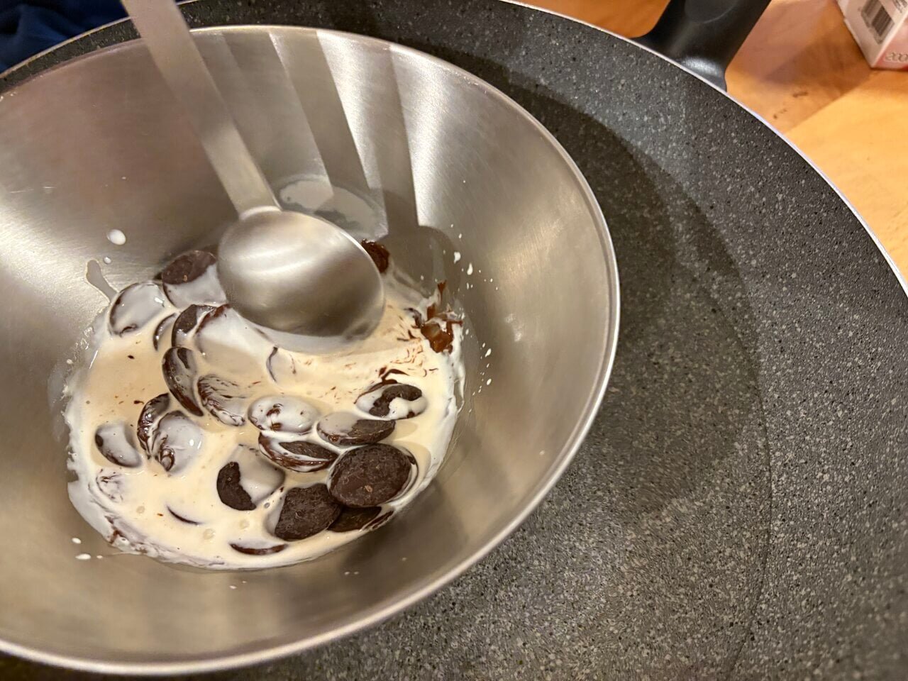 Measure 35ml of heavy cream and put it in a bowl, then place it over a hot water bath. The water should be around 80°C. Just be careful not to let it boil.
