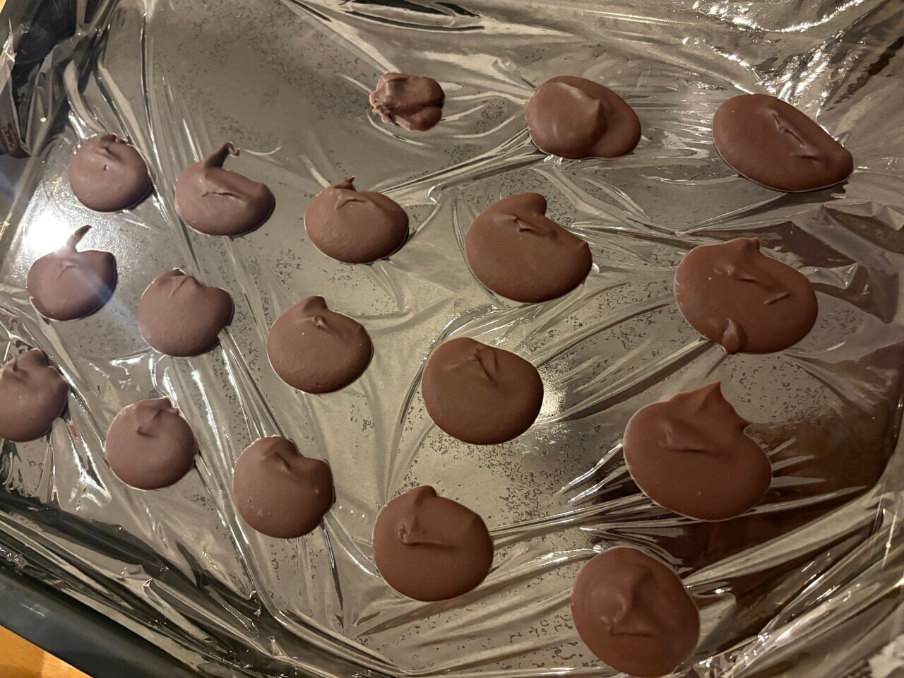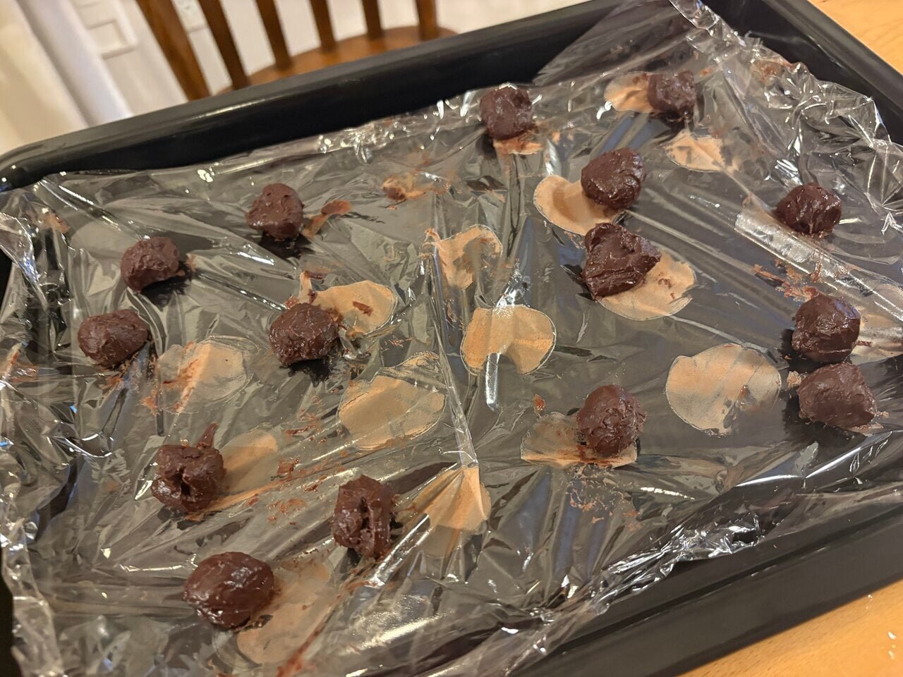 Spoon the mixed chocolate onto plastic wrap, separating it into portions. Trying to even out the size of each one made it seem like there were more pieces than I expected. Once finished separating, I placed it directly into the refrigerator. I waited about 20 minutes until it reached a consistency that could be rolled by hand.