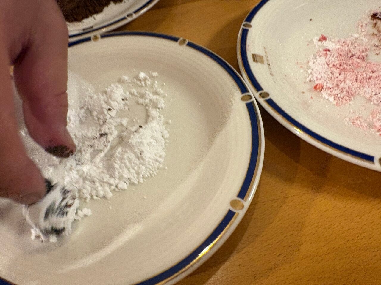 Arrange the rolled chocolate and prepare the toppings. For the truffle chocolate, combine cocoa powder, powdered sugar, freeze-dried strawberries, along with equal amounts of powdered sugar and freeze-dried strawberries to make strawberry powdered sugar, and separate them into individual containers. The freeze-dried strawberries can be easily crushed by just pressing lightly on the bag. No special tools are needed, and this is a straightforward cooking process.