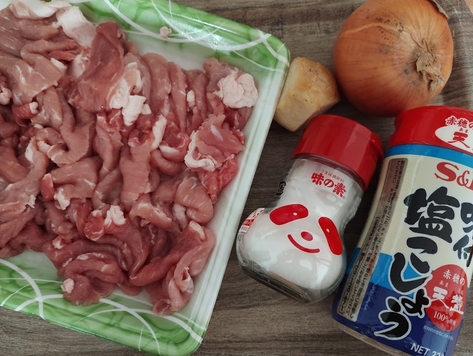 Heat salad oil in a frying pan, spread the pork and sauté. When the pork is browned, add the onion and sauté.