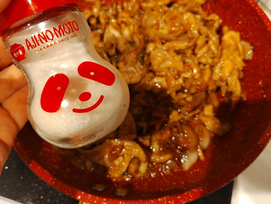 When the color of the onion becomes translucent and is cooked through, lower the heat to medium-low and add sake, mirin, soy sauce, and sugar. Once the sauce is well mixed, add all the chopped ginger and finish with monosodium glutamate. Plate it up and add fresh vegetables for garnish to complete.