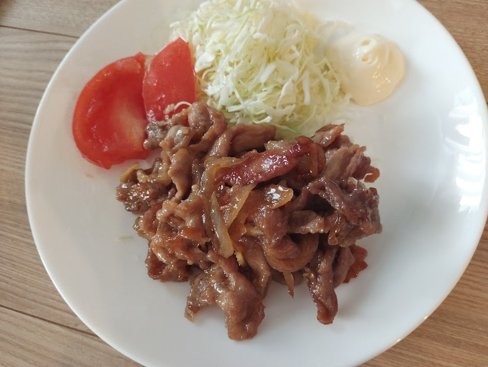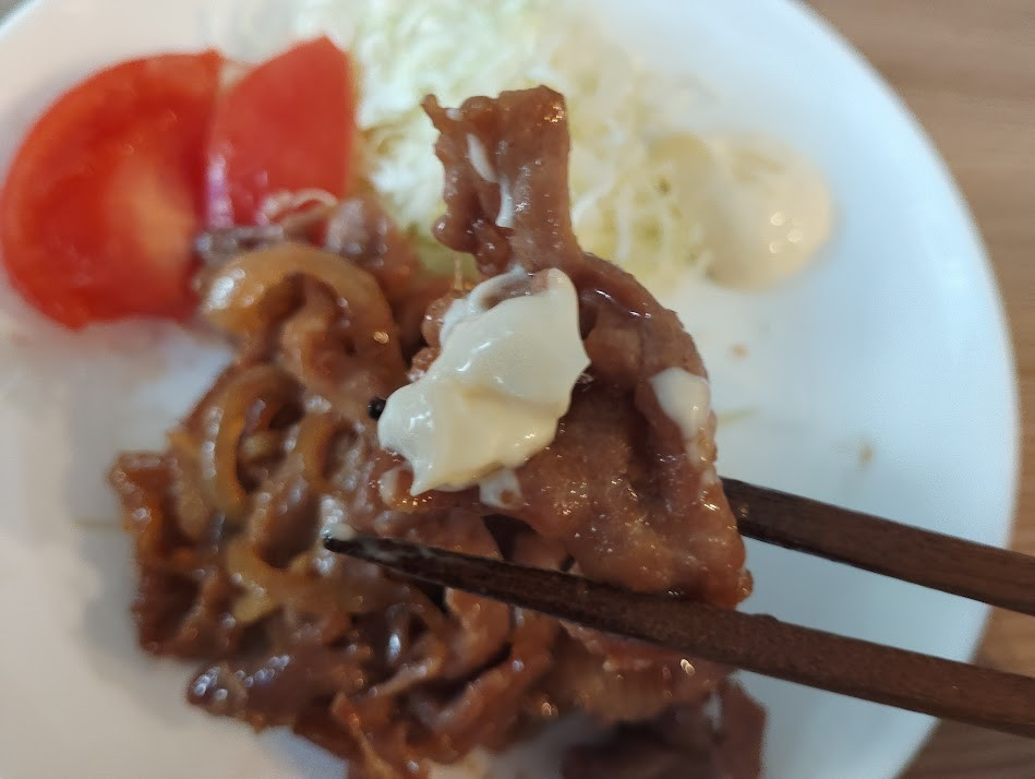 The "Ultimate Pork Ginger Stir-fry" I made this time, as suggested by Ryuji, also pairs well with mayonnaise, so I took a bite for a flavor change. The sweetness and spiciness of the ginger stir-fry become mellow with the mayonnaise, making it go so well with white rice! It was truly a dish that could be called a rice terror.