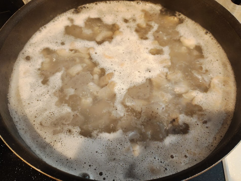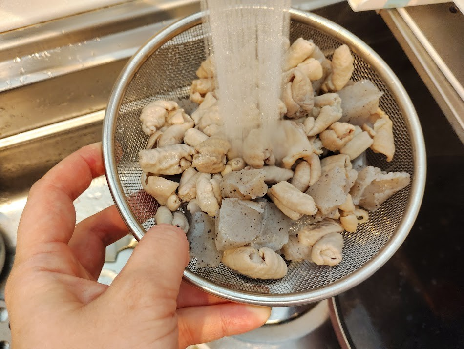 Once it comes to a boil and the scum starts bubbling up, remove it with a strainer and rinse it under running water.