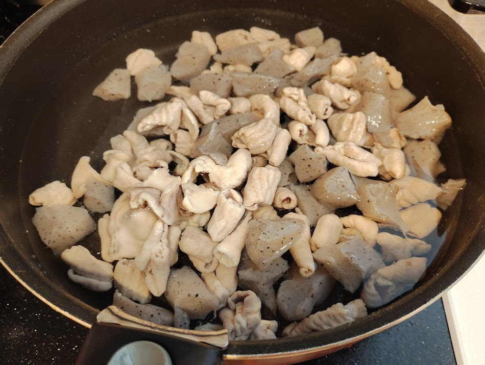 After rinsing the pork offal and konnyaku under running water, return them to a clean pot, add 750cc of water, and simmer over low heat. It is said that starting from water prevents the offal from becoming mushy.