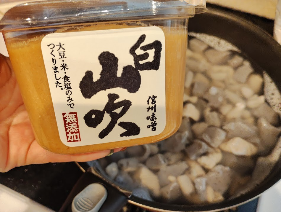 When the pork offal is cooked, add yamabuki miso, Ajinomoto, and hondashi. Here! The key point emphasized by Ryuji's grandmother is that you must use this "yamabuki miso" (white miso type). Since Ryuji's grandfather only ate this miso, Ryuji's family is said to regularly use this miso.