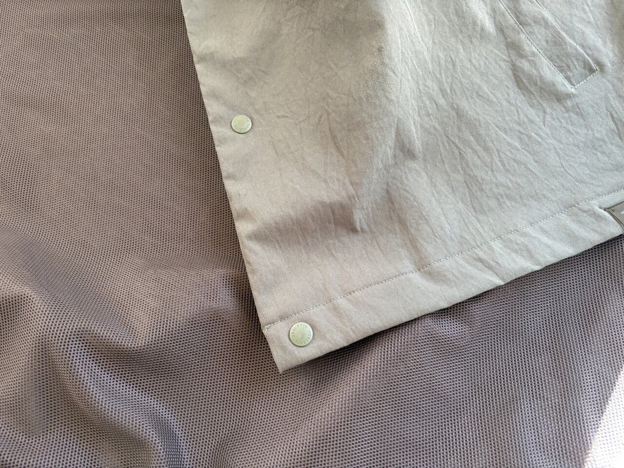 The outer fabric has a cotton-like feel, offering a moderate wrinkled texture and a resilient material. It's not overly sporty, so it blends well in the city. With high basic performance in water resistance and wind protection, it’s comfortable while walking; it’s easy to adjust by opening the front if it's hot or layering up if it's cold, making it quite useful.