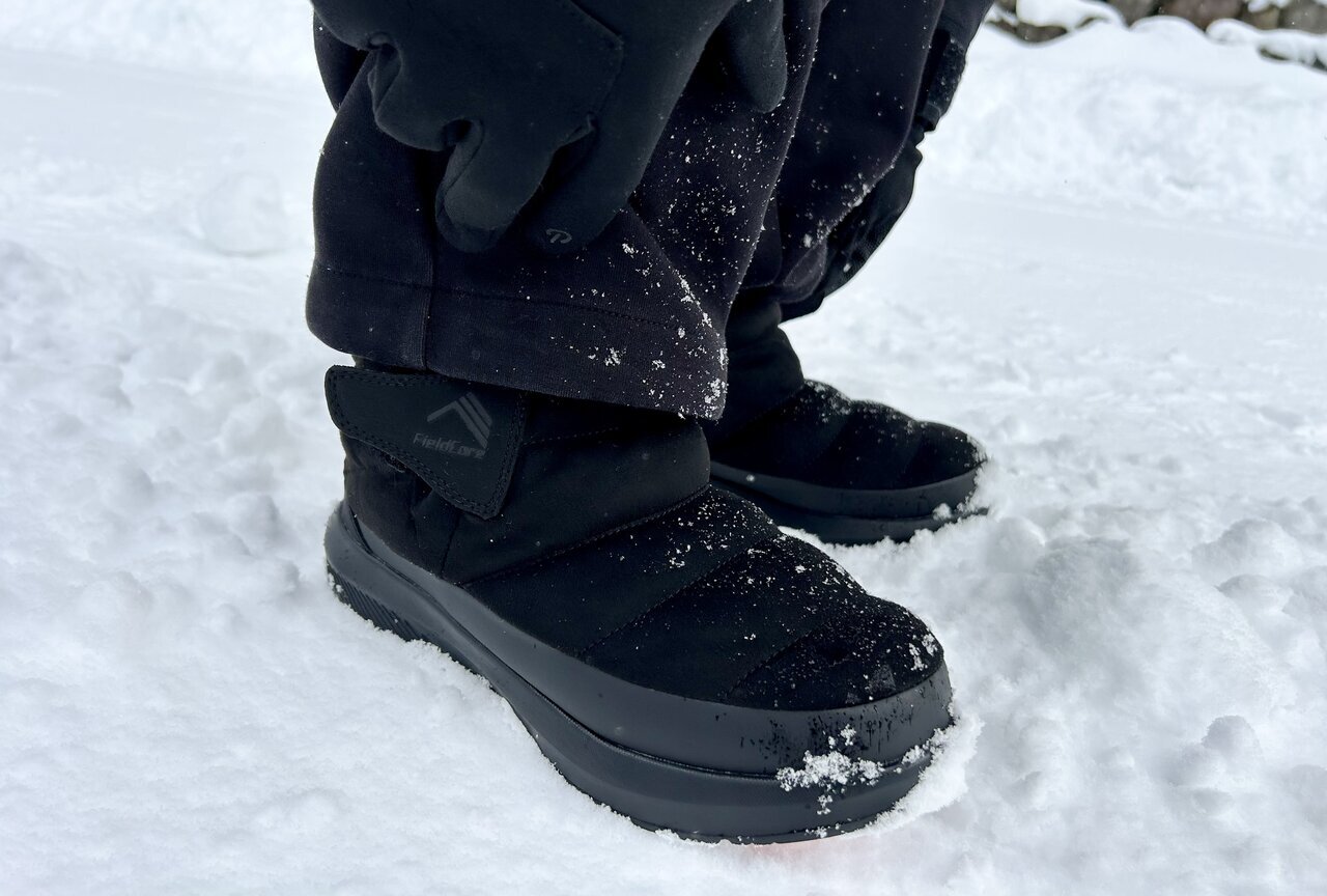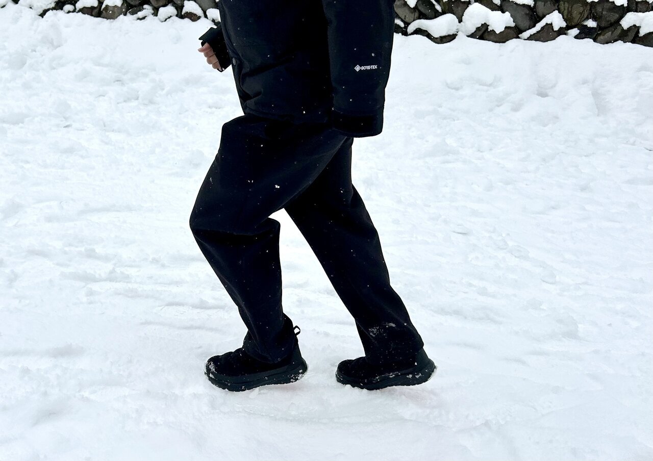 They use a high-performance heat-retaining material called LITHERMO, and upon holding them, the upper fabric feels thick and seems like it will definitely block the cold air. But are they really warm and easy to wear? Let's check their performance in the snow.