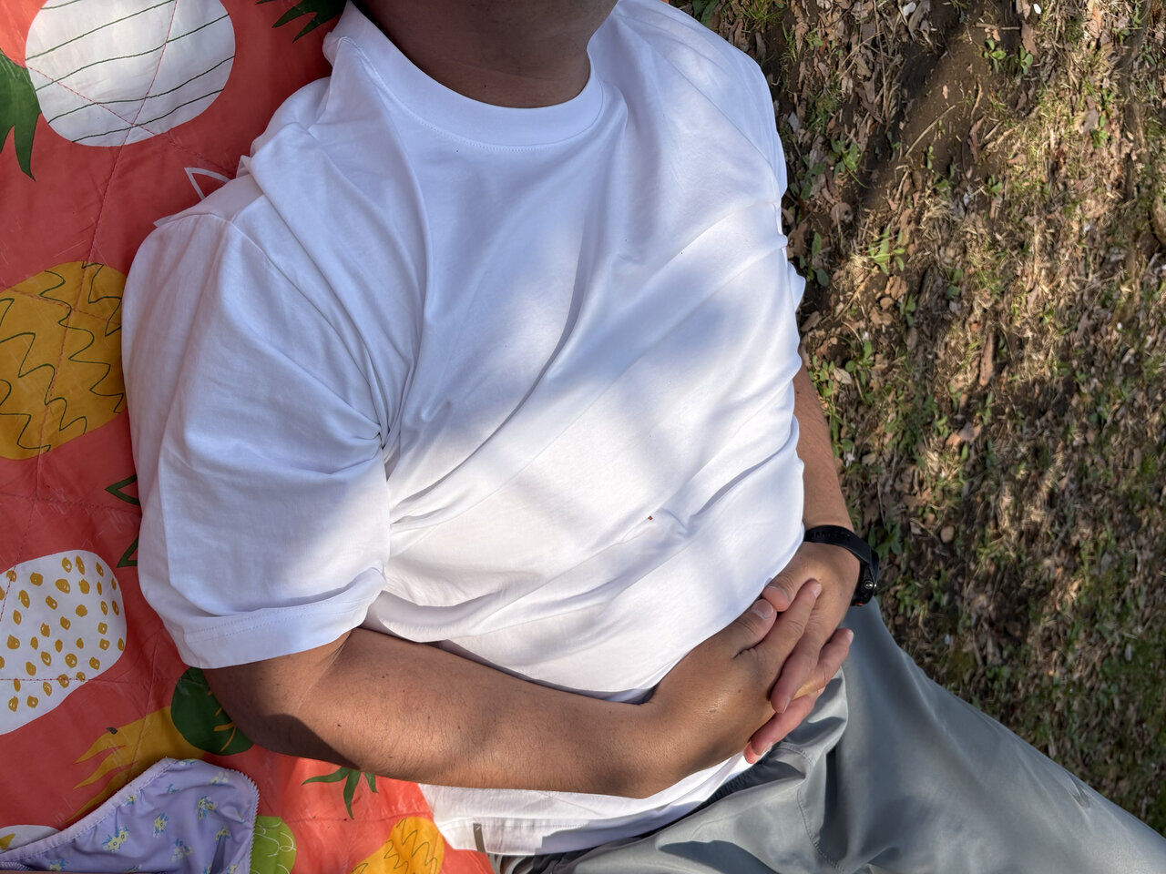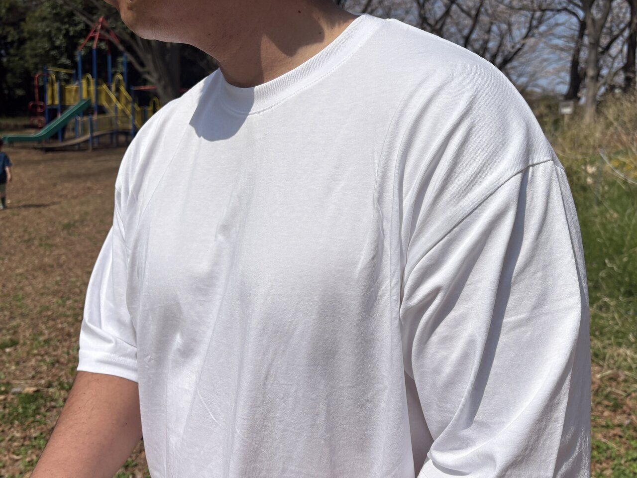 I wore the white size 3L. Usually, I often choose sizes LL to 3L due to my body type, but this t-shirt gives a slightly more relaxed impression. It has enough room in the body width, doesn't cling to the body lines, and there's no stress around the chest and stomach areas. Even when sitting, there’s no feeling of pressure, and I was able to maintain a relaxed state.