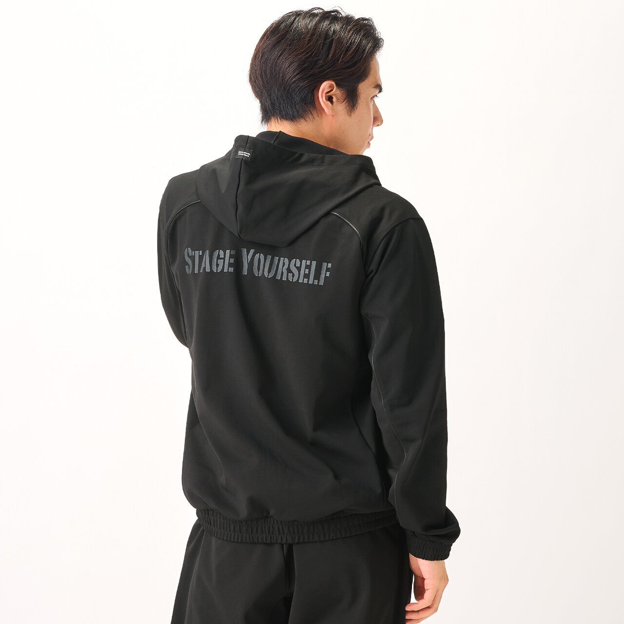 It has a cool "STAGE YOURSELF" logo on the back. It seems perfect for throwing on during chilly days, and it could also serve well as an inner layer for sports scenes or when wearing down.