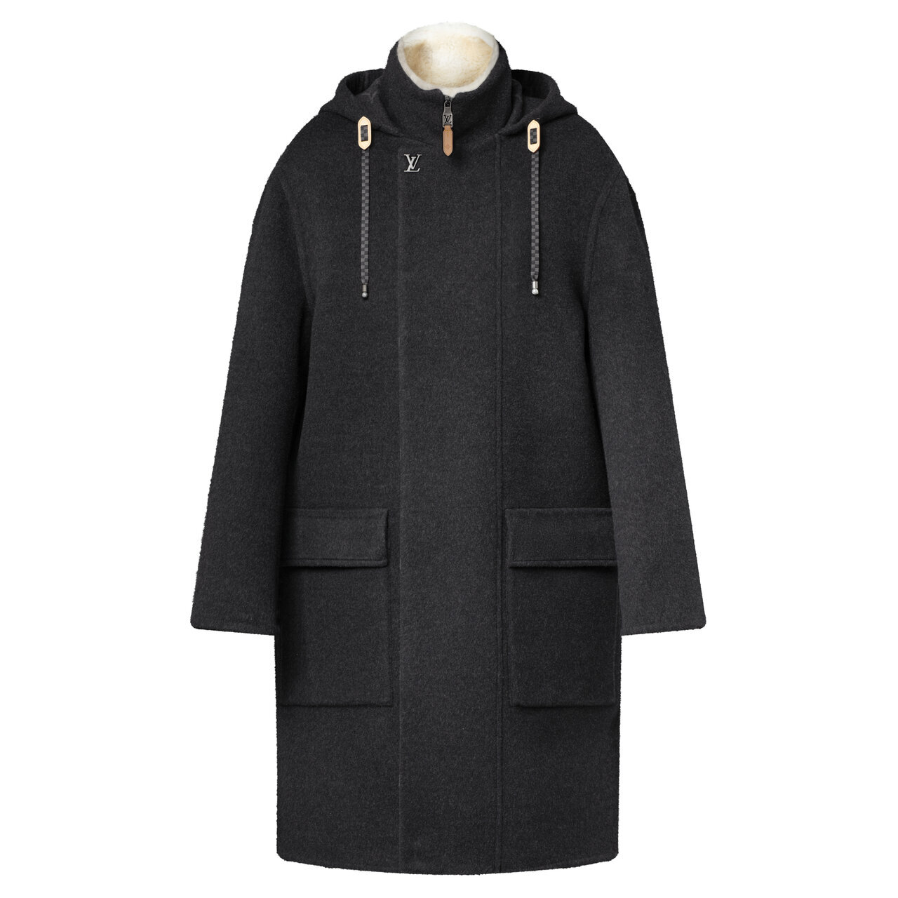 Pay attention to the adjustable hood that wraps around the neck and the high collar with shearling lining. The drawstring featuring a damier pattern expressed in the weave, along with the LV ornament placed at the top of the placket, elegantly ties the coat together.