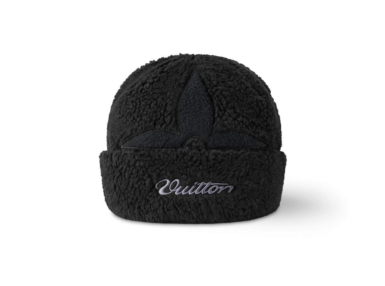 "The Beanie Signature Fleece" is a must-have item that elevates your winter attire. It’s a stylish beanie with a black monochrome design featuring a white "Vuitton" signature embroidered on it. Made from a warm wool blend, it gently keeps your head warm.