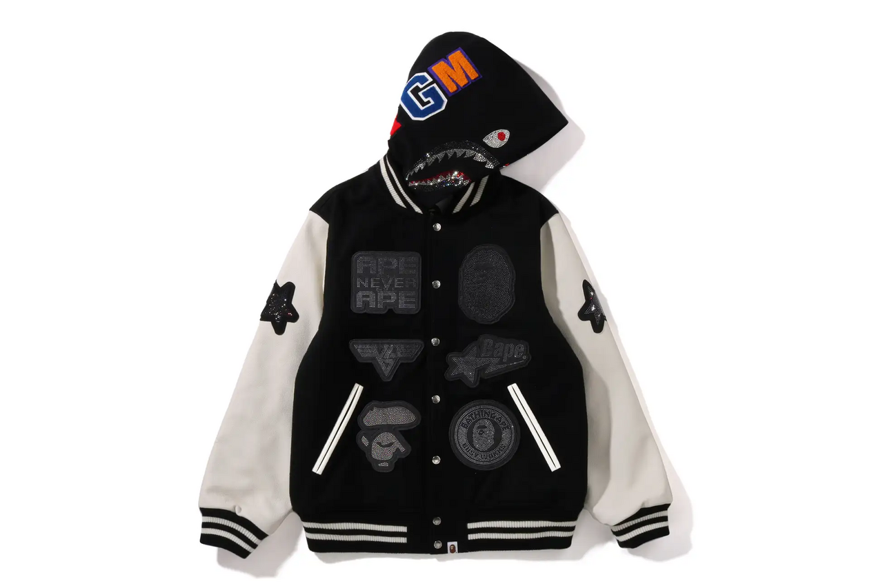 The jacket, made of black melton and white leather, features a high-end finish adorned with the sparkle of Swarovski. Yet, it maintains the distinctive street aesthetic typical of BAPE, achieving a splendid balance.