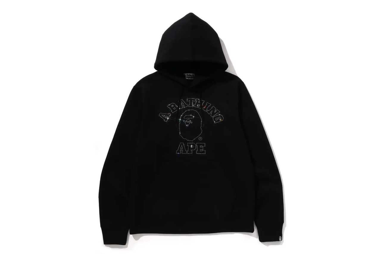 The hoodie, featuring a college logo expressed in crystals on the chest, retains BAPE's classic ambiance while adding a transformation through sparkle. The transparent crystals shine against the black base, creating a three-dimensional effect when light hits them.