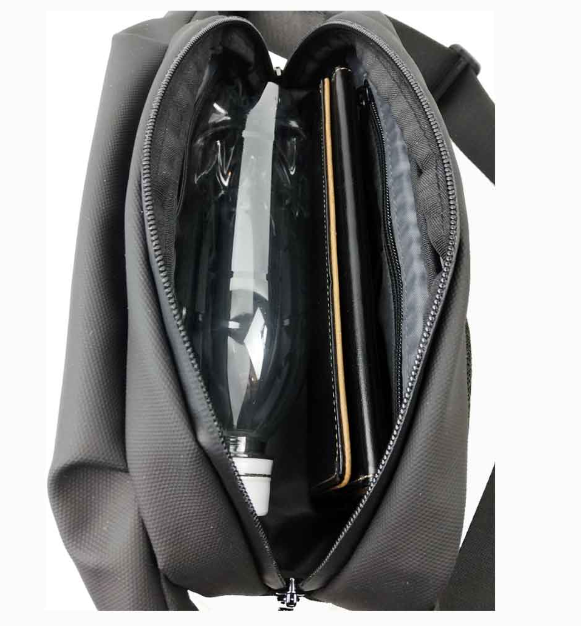 The "Bottle in Sling 2.0" is a diagonal bag that allows you to carry plenty of items while keeping your hands free. It has a sleek and slim design, but surprisingly shows great storage capacity. As shown in the photo, it can fit an iPad, a thick book, and a PET bottle perfectly.