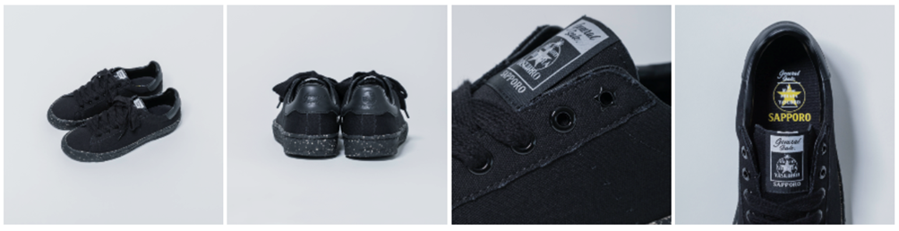 This collaboration sneaker is an original design born from the partnership between "Sapporo Draft Beer Black Label" and the General Scale. brand. It features a calm color scheme primarily in black, while playful details such as star-shaped eyelets and the logo on the heel are sprinkled throughout.
