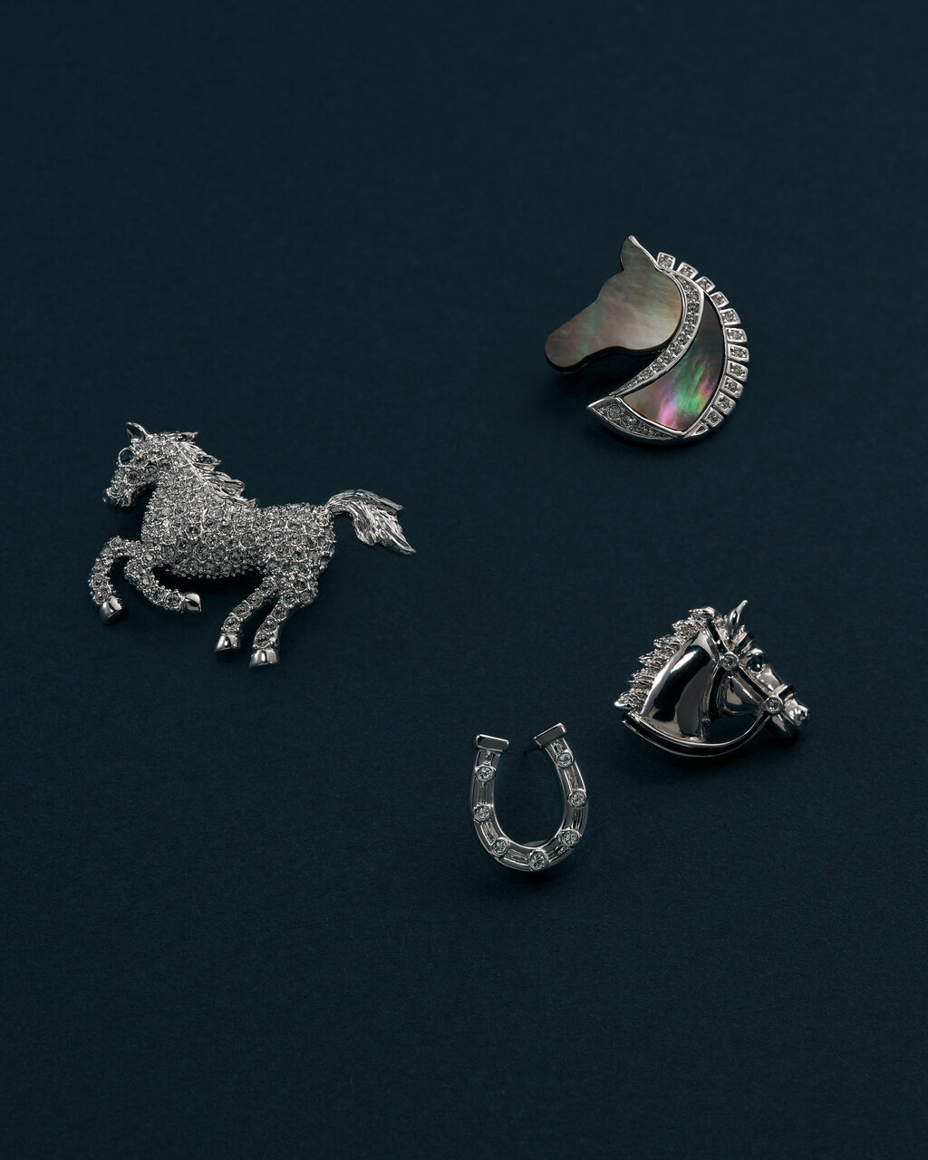 This is a set of tack pin brooches featuring horseshoes and horses. The horseshoe, said to 'catch good luck in its U-shape' and 'store happiness', sparkles with seven cut glass pieces. It seems to be mindful of the lucky number seven as well.