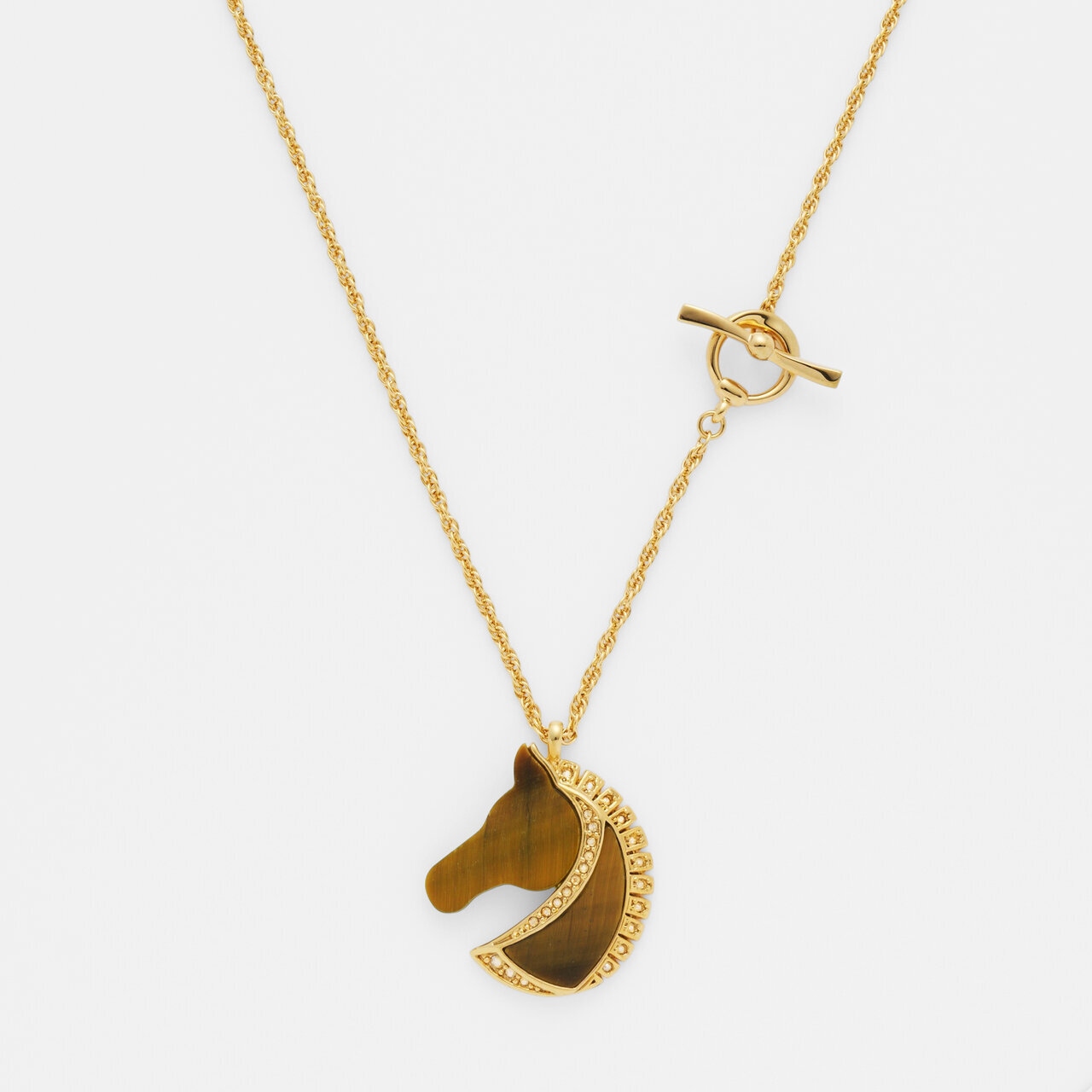 The chain with a rope pattern and the toggle clasp reminiscent of horse gear also matches the horse motif.