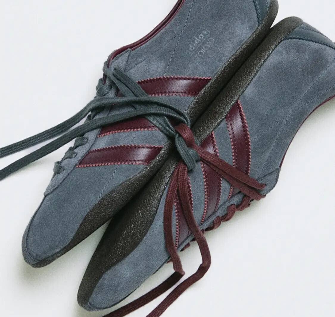 "adidas originals Exclusive TOKYO" features a color scheme based on a nuanced gray, combined with deep burgundy Three Stripes. It’s a pair that encapsulates adult charm at your feet. When styled with a monochrome outfit, it adds a subtle allure, and when paired with classic colors like beige or navy, it creates a refined contrast without disrupting the tone.