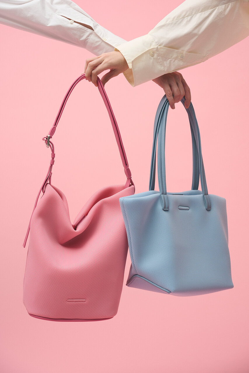 The "Mesh Tote" in a shoulder-carry style and the "Mesh Hobo" that can be used as a shoulder bag or crossbody are both available. Both have wide openings for smooth access to stored items and have enough capacity to accommodate bulky luggage. The colors include black and gray khaki, along with light shades of pale pink and light blue. These items are versatile, suitable not only for commuting and school but also for yoga, the gym, and outings on weekends.
