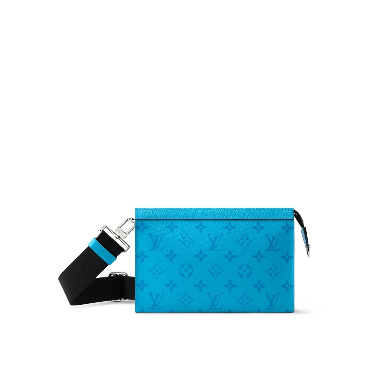 The "Trio Messenger" is also finished by combining various compartments. The vibrant colors and tone-on-tone monogram pattern, along with the black wide strap, create a modern impression. It consists of a main pouch, a front zippered pocket, and a removable coin purse, making it a sophisticated, versatile item.