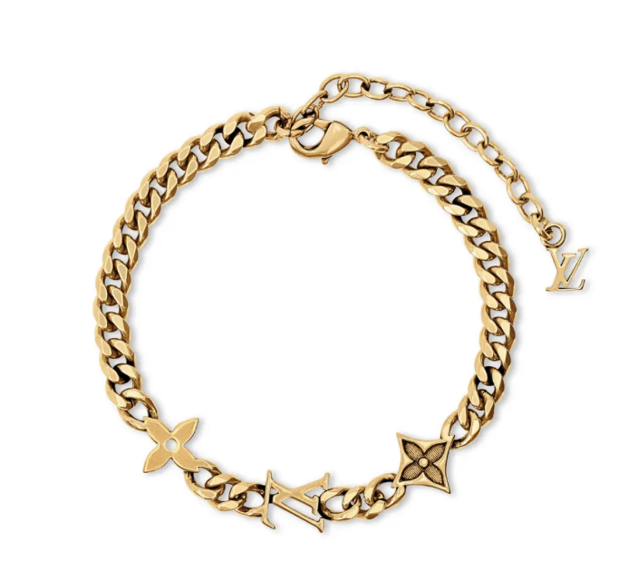 The "Bracelet - Monogram Raw" exudes charm as a statement item despite its understated details. The flat link chain, adorned with diverse emblems, is adjustable for comfortable daily wear.
