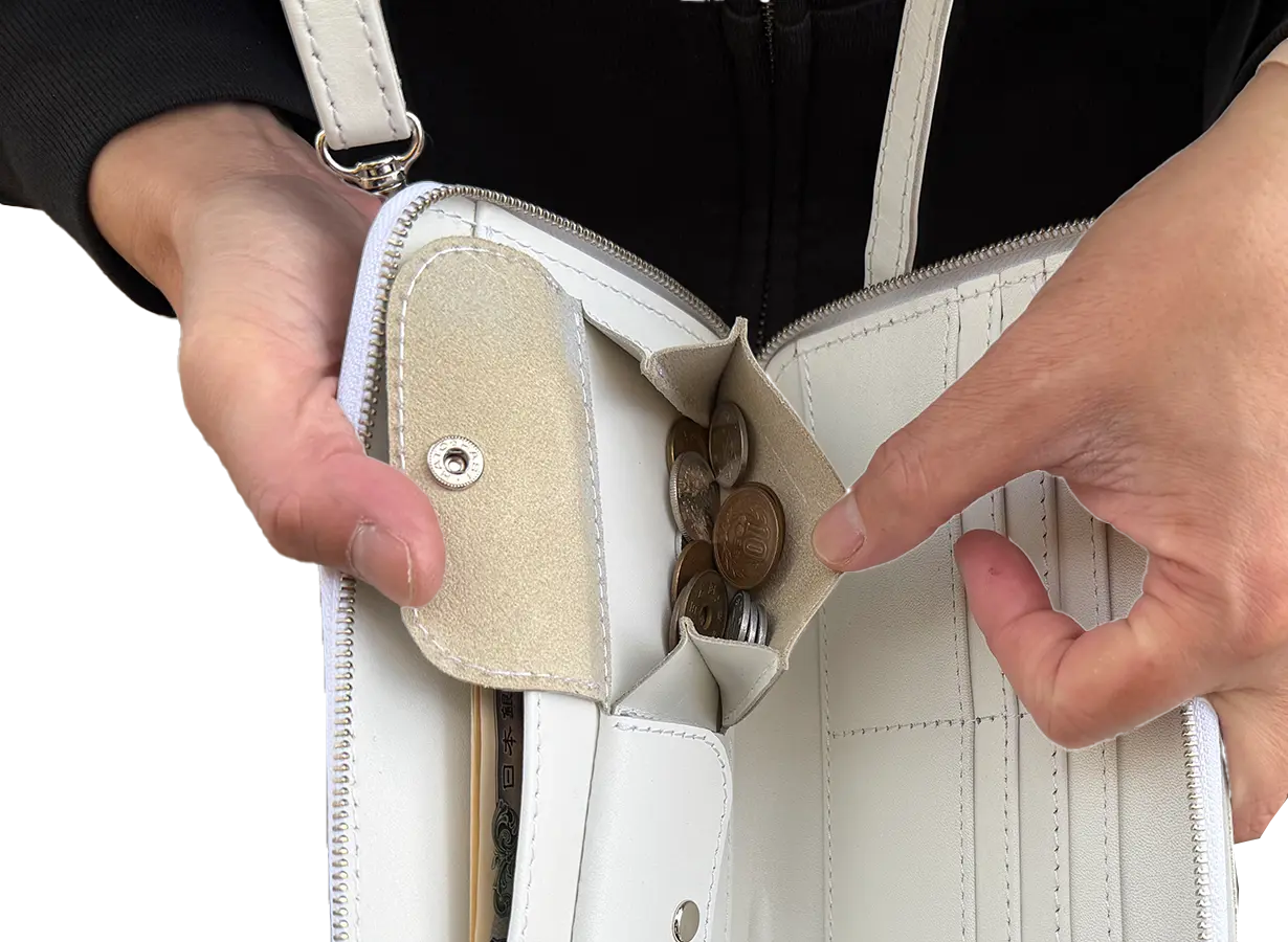 The coin pouch of “KARAMI 2.0” uses a snap button and has depth on both sides. It opens wide, allowing you to easily see the contents, making it easier to take out coins one by one. You can finish your payment without fumbling at the register, so it’s reassuring during peak hours when lines tend to form.