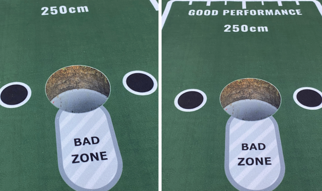 One of the features of the "3D Pattern Mat" is that it incorporates 3D cups utilizing optical illusion (trick art) technology. This creates an illusion that there is a real cup on the mat. Additionally, it adopts a 12-foot fast green comparable to those on the PGA Tour, striving for a realistic touch, pressure, and stroke replication.