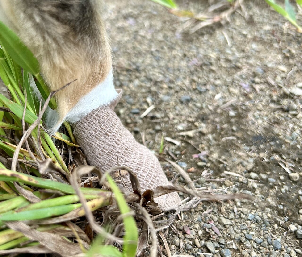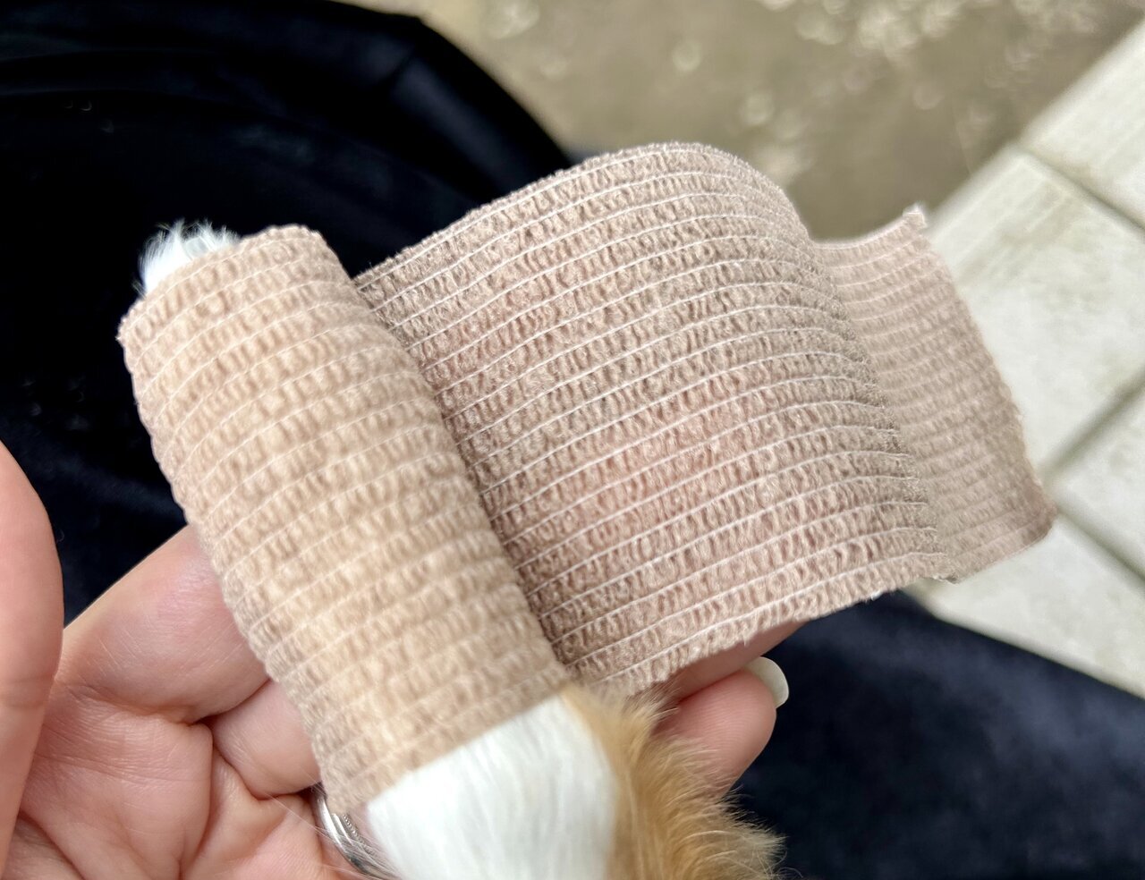 If you only wrap the toes, they can slip off when running, so the trick is to wrap them a bit higher. When wrapped up to around the top image, they covered his feet all the way to the end without coming off during our walk.