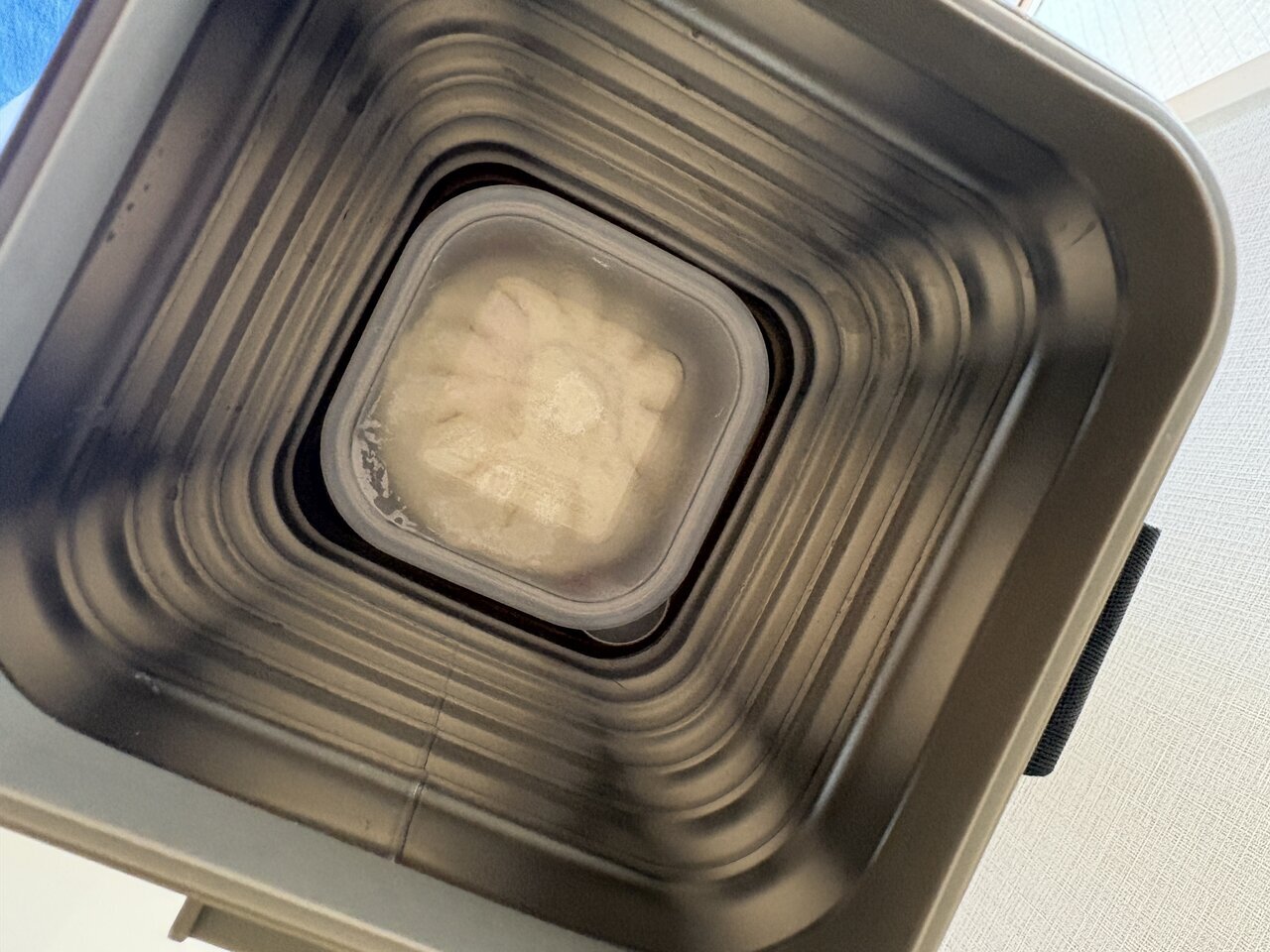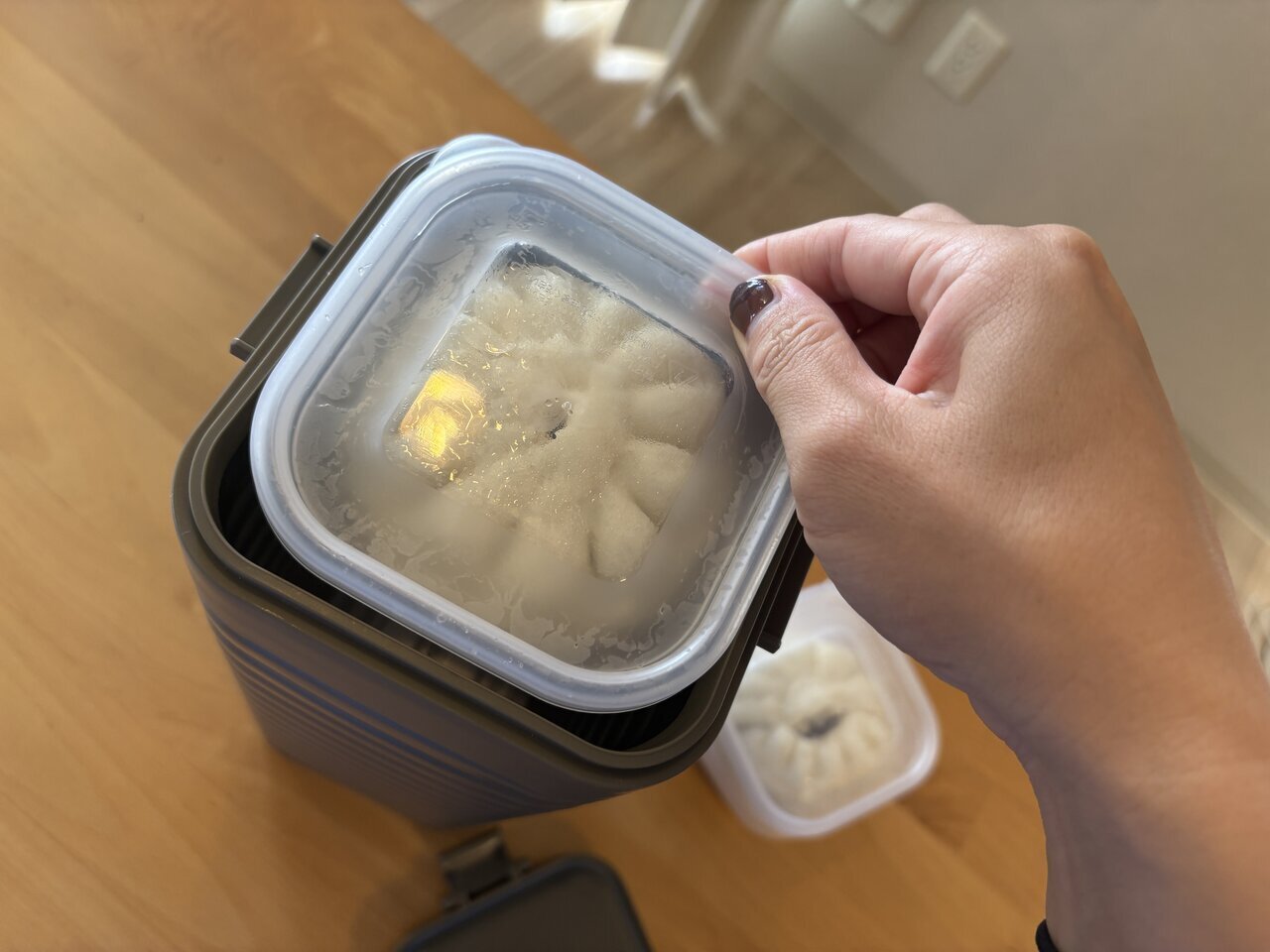 By the way, the storage container (Tupper) used to put in the meat bun is about 10.3×10.3×5.4cm from Daiso. The meat bun fit just right when the lid was closed. The Workman’s 2-liter slim vacuum hybrid container can hold five vertically.