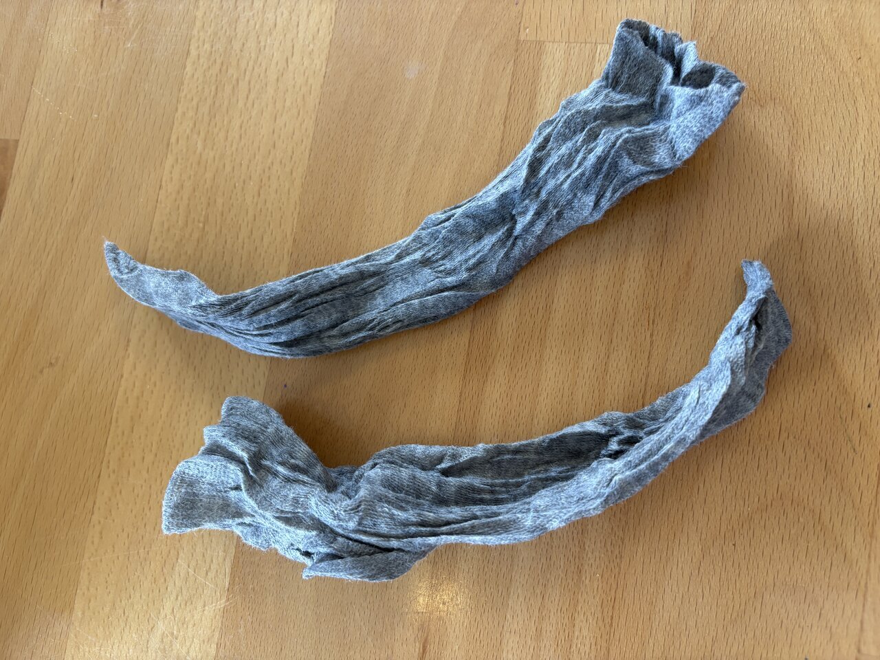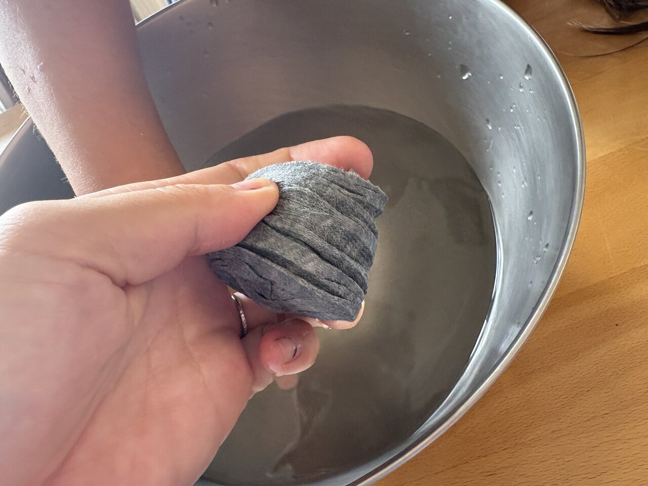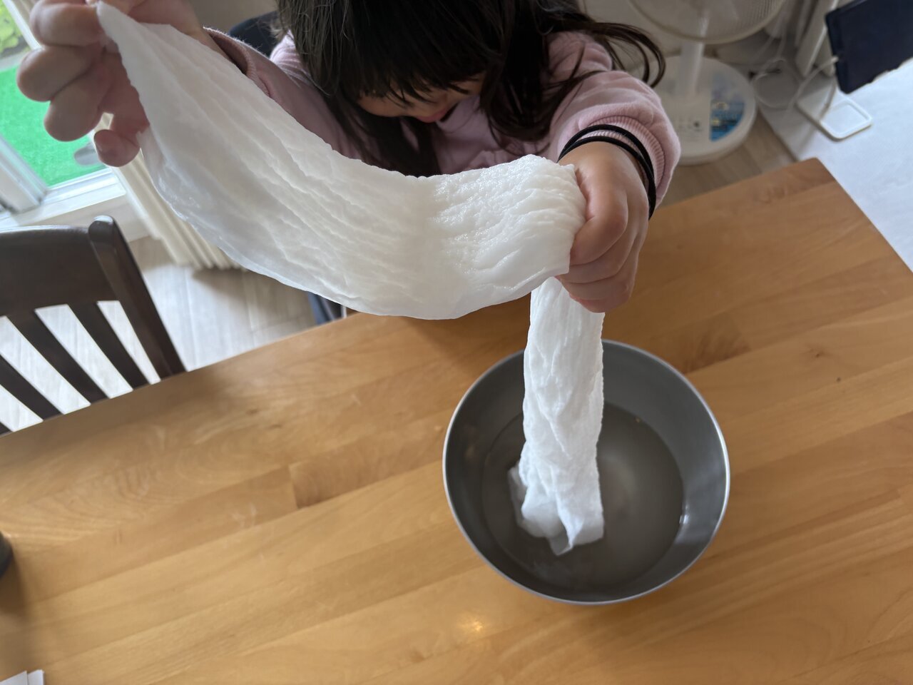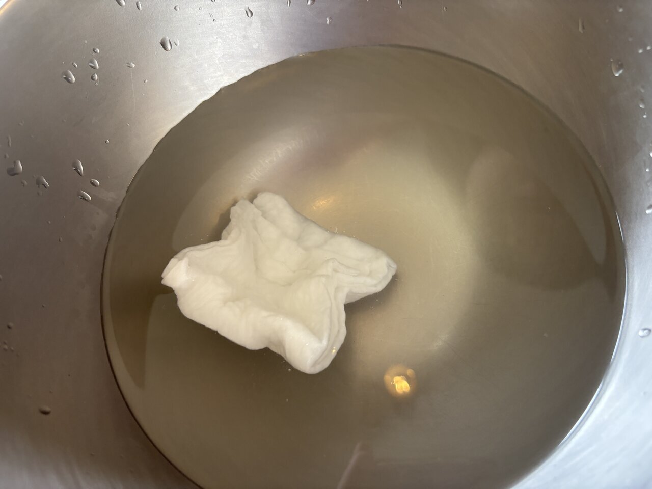 When submerged in water, it gradually softens while absorbing air, slowly returning to the shape of a sock. It takes about a minute to completely loosen up.