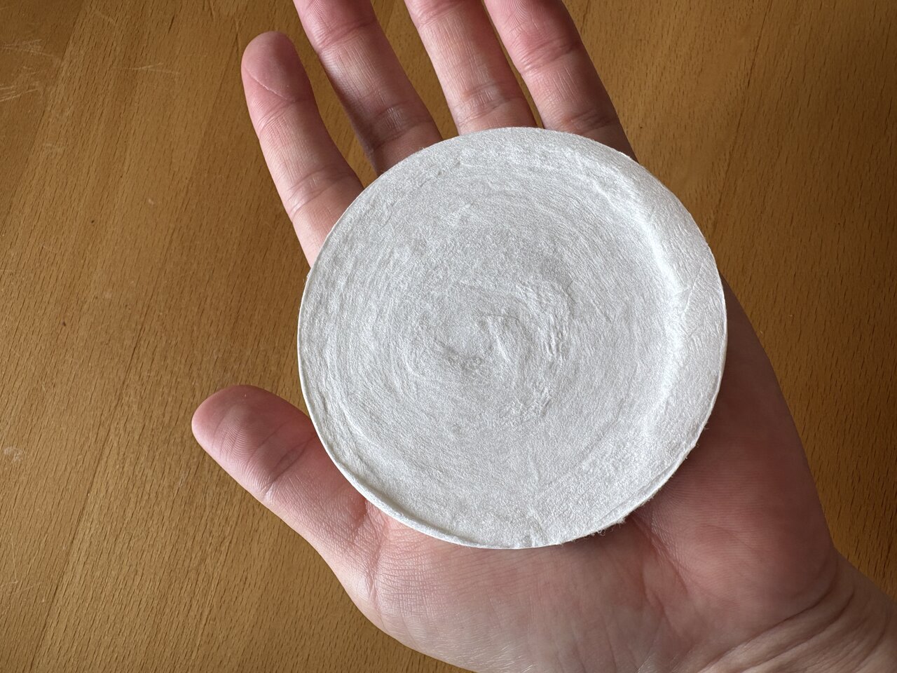 Let’s take a look at a slightly larger towel. The compressed bath towel (approximately 100 x 70 cm) comes in a small round pack that fits in the palm of your hand. It’s surprisingly lightweight, like a thick coaster. It has a size that fits snugly in the gaps of a disaster preparedness bag.